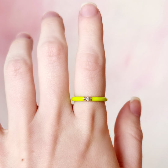 Add a POP of color and sparkle to your stack with a 14k gold enamel band in color Neon Yellow. One .05 carat diamond, F Color and Si Clarity. Band is 2.5mm wide.
