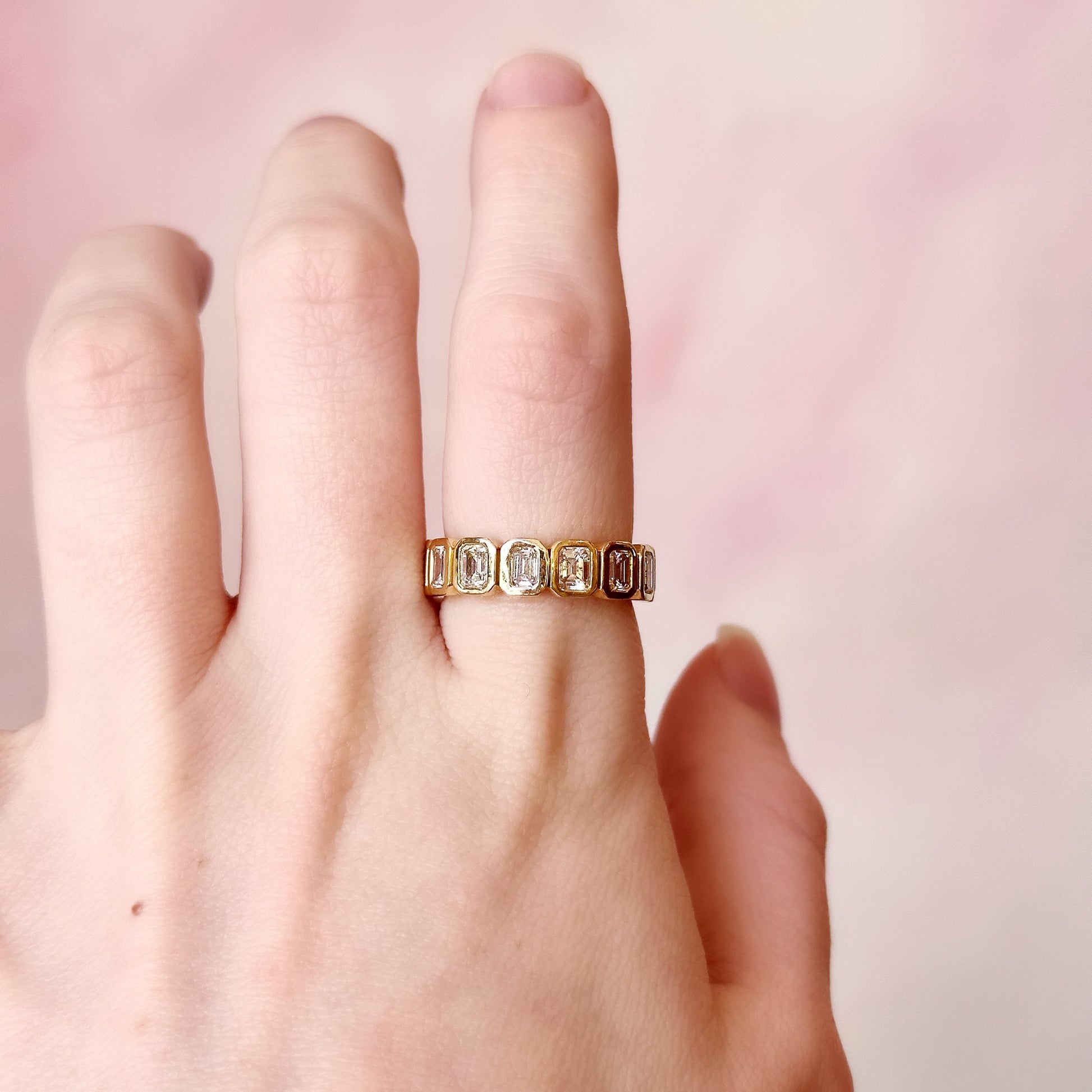 "Junie" in her classic form is a 14k yellow gold half-eternity band (4.5 grams) featuring 8 emerald-cut, bezel-set diamonds totaling approximately 1.34 carats. Sleek and sophisticated, it’s the perfect balance of bold gold and bright sparkle!
