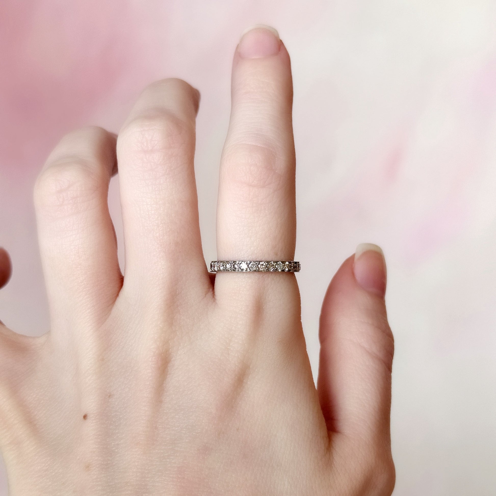 A 1920's platinum eternity band set with full-cut diamonds totaling approximately 1.20 carats. Measuring 2.56 mm wide and 1.51 mm high, this ring offers a refined, elegant sparkle—an enduring classic in a sleek platinum setting.