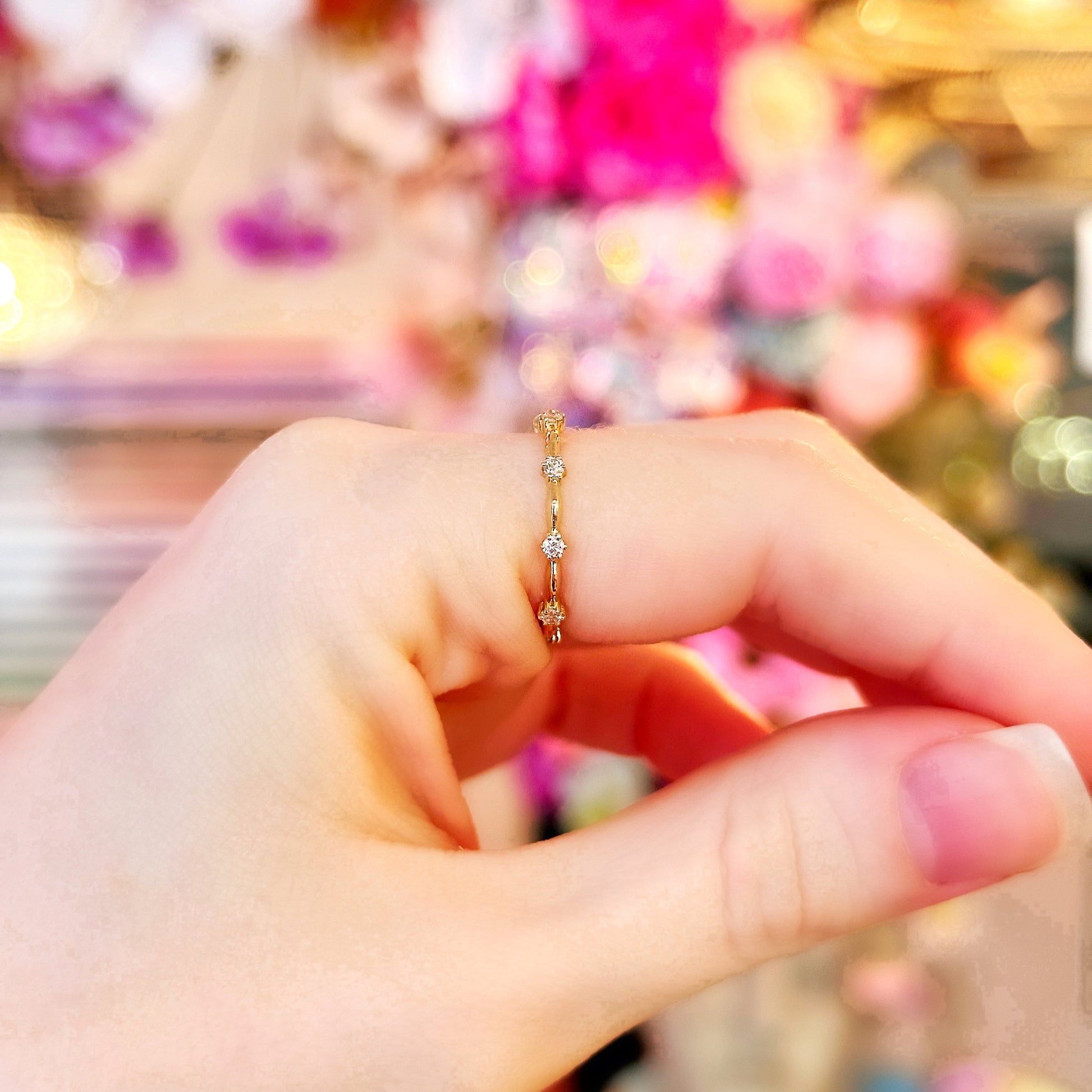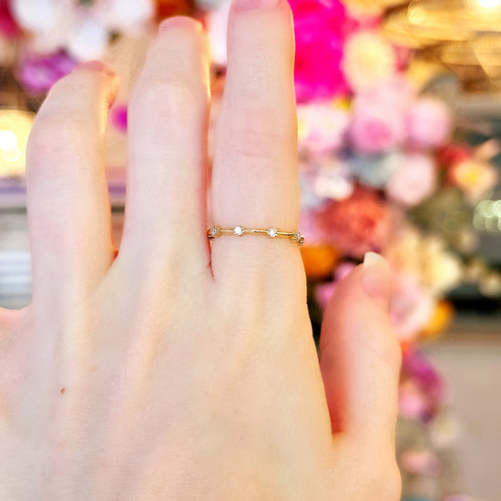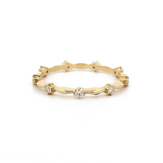 "Larissa" in her classic form is a 14k yellow gold station eternity band (1.10 grams) featuring 0.220 carats of F color, SI1 clarity diamonds. Delicate and timeless, this ring adds a subtle sparkle to your everyday look and is perfect for stacking or wearing alone!