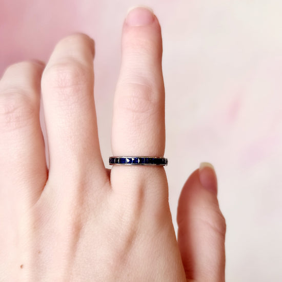 Living fully as both girl and goddess, this Art Deco 1930's platinum and sapphire band celebrates the feminine magic and mystery within you.