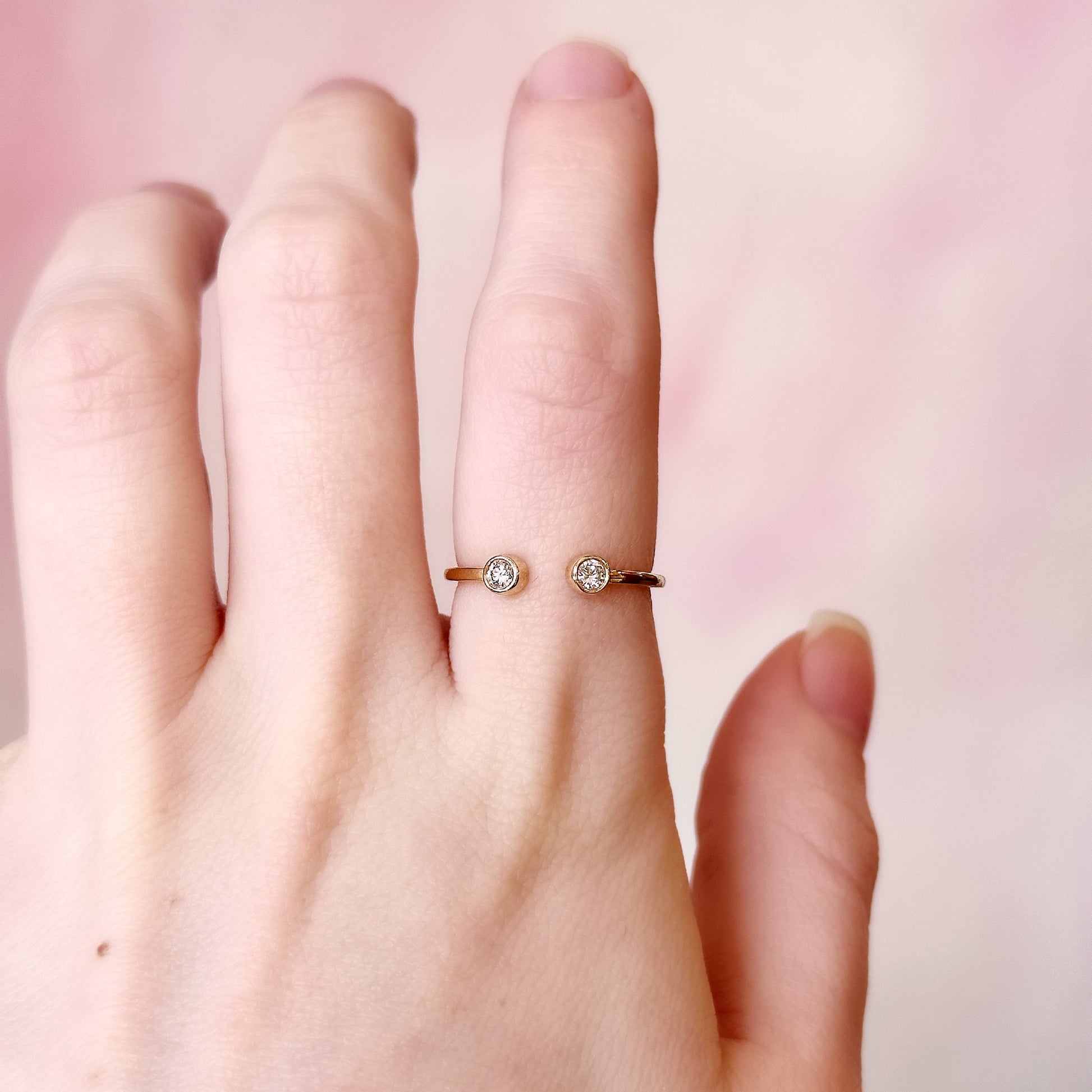 "Lucine" in her original form is a 14k yellow gold open ring (1.35 grams) featuring two bezel-set diamonds (0.130 carats, F color, SI1 clarity), one on each end. Delicate and modern, this ring adds a subtle sparkle to your everyday look and pairs beautifully with other rings for layering.