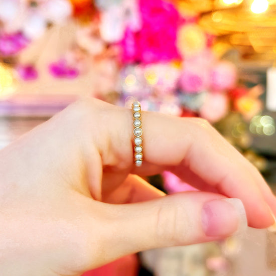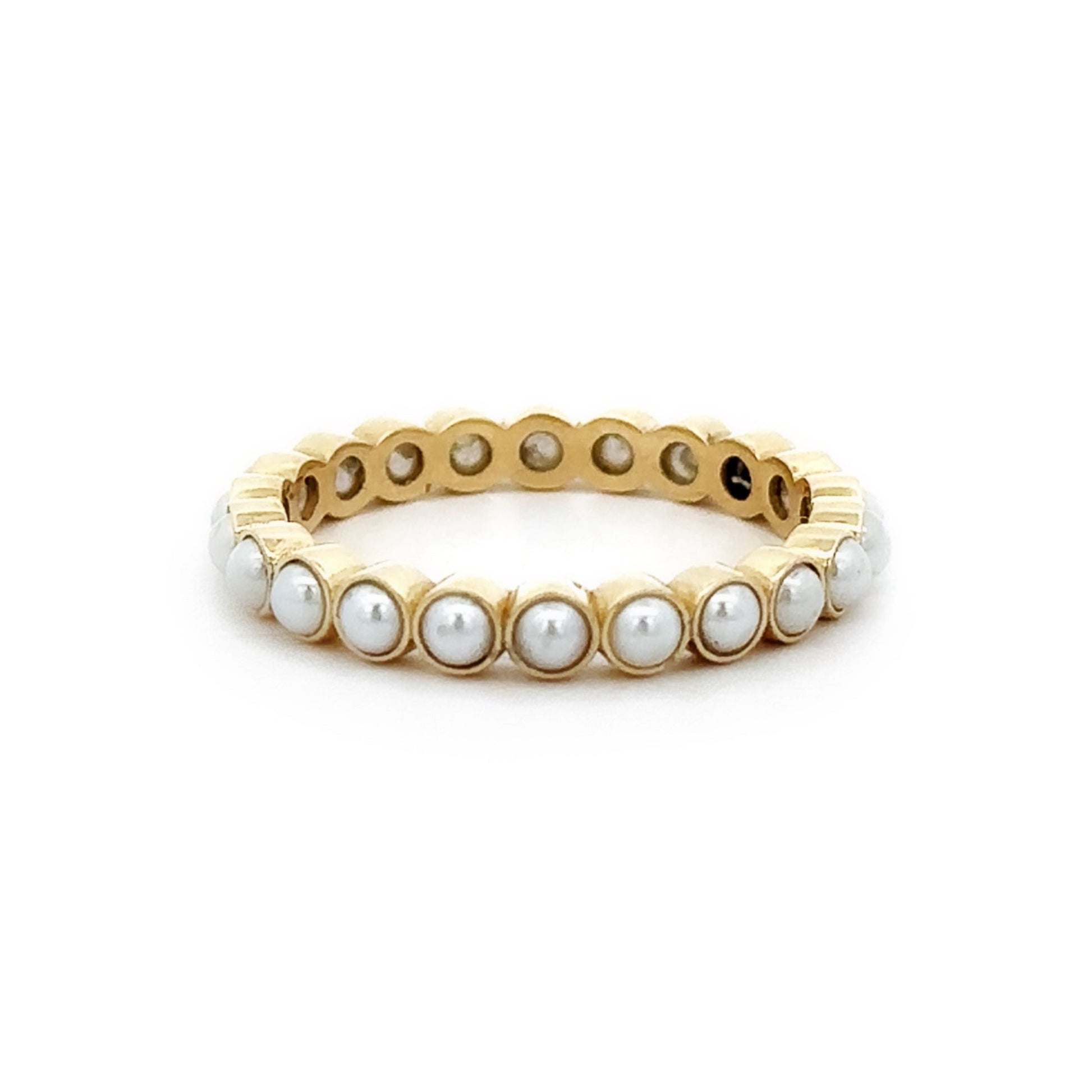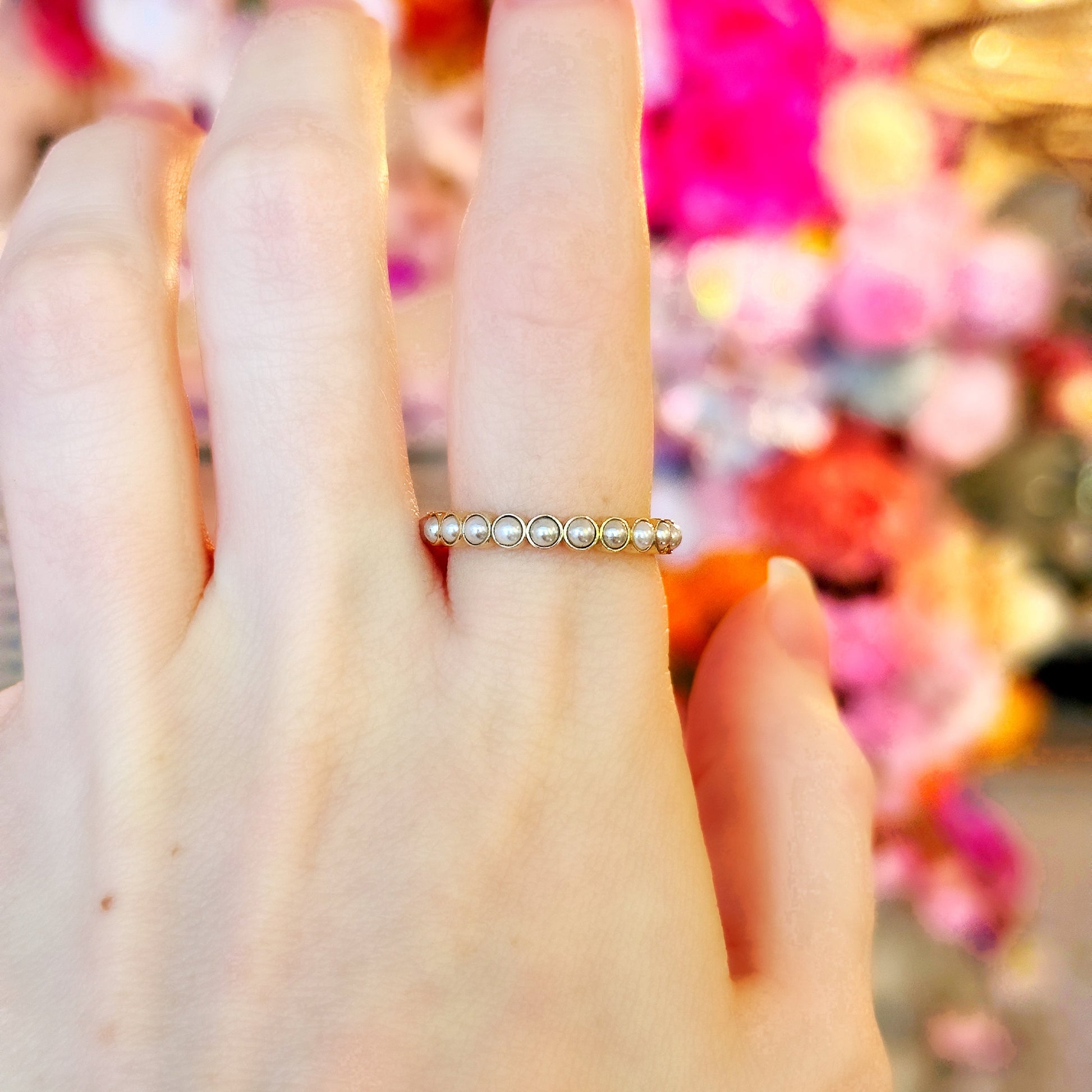 "Posy" in her classic form is a 14k yellow gold seed pearl eternity band (1.50 grams) featuring a continuous row of delicate seed pearls. Timeless, elegant, and perfect for adding subtle charm to your everyday look or stacking with other rings.