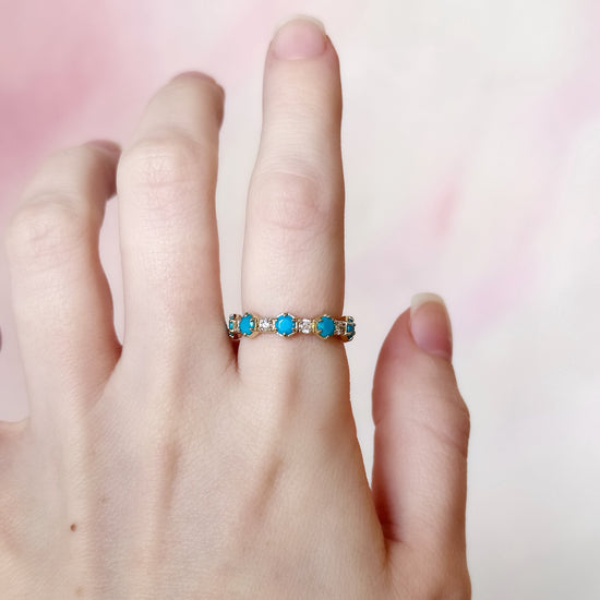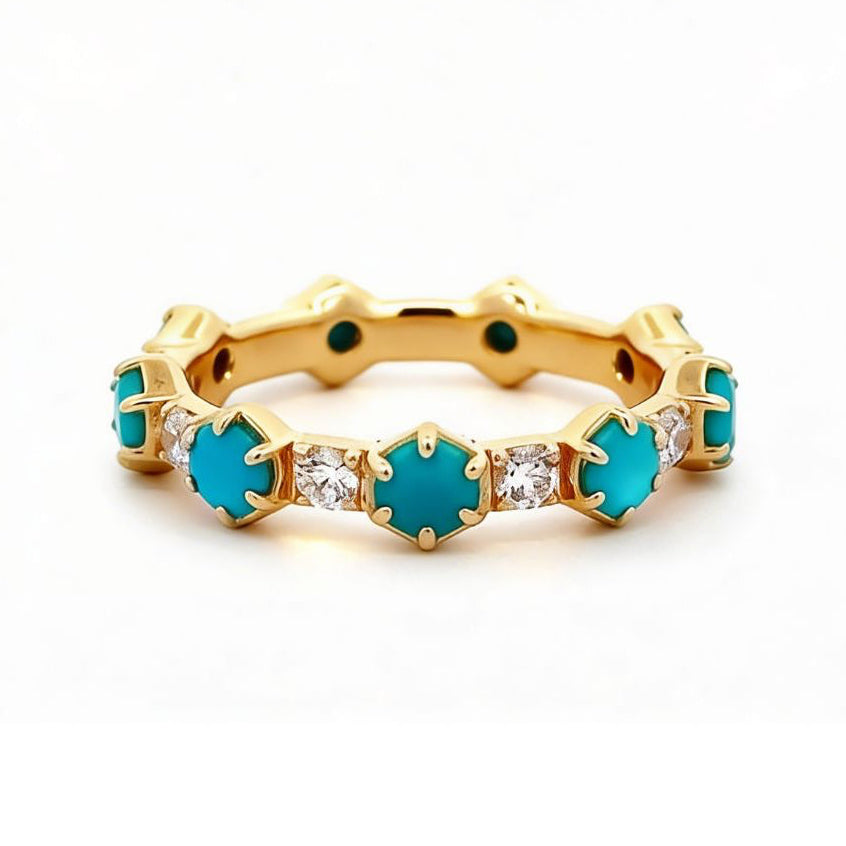 "Starley" in her classic form consists of turquoise and diamonds set in 14k yellow gold. We can customize this design with any stone combination and setting your heart desires!