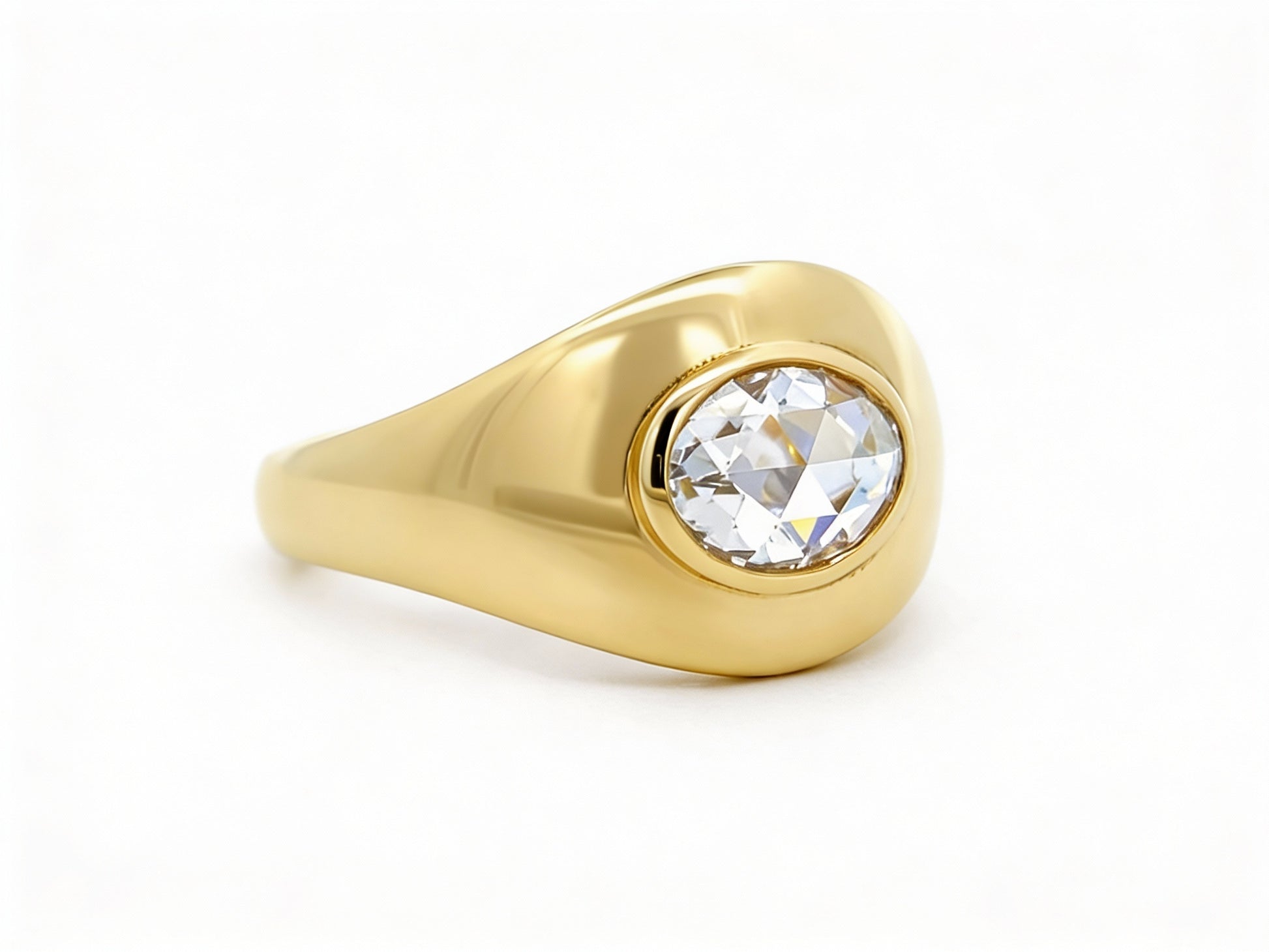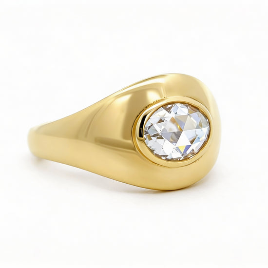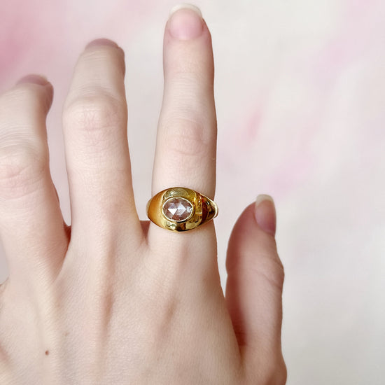 Our vintage 1970s rose-cut oval diamond ring carries a timeless elegance with its soft, luminous sparkle. Set in 14k yellow gold and weighing 5.80 grams, it showcases a 1.05-carat diamond (H color, VS clarity). The rose-cut’s subtle shimmer and oval shape lend the piece a graceful, understated beauty that feels both classic and effortlessly chic.