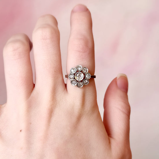 A 1900s Victorian ring crafted in 15k yellow and white gold, weighing 3.30 grams and set with .90 carats of old mine cut diamonds. Rich in detail and warmth, this antique piece blends two tones of gold for a subtle, timeless contrast.