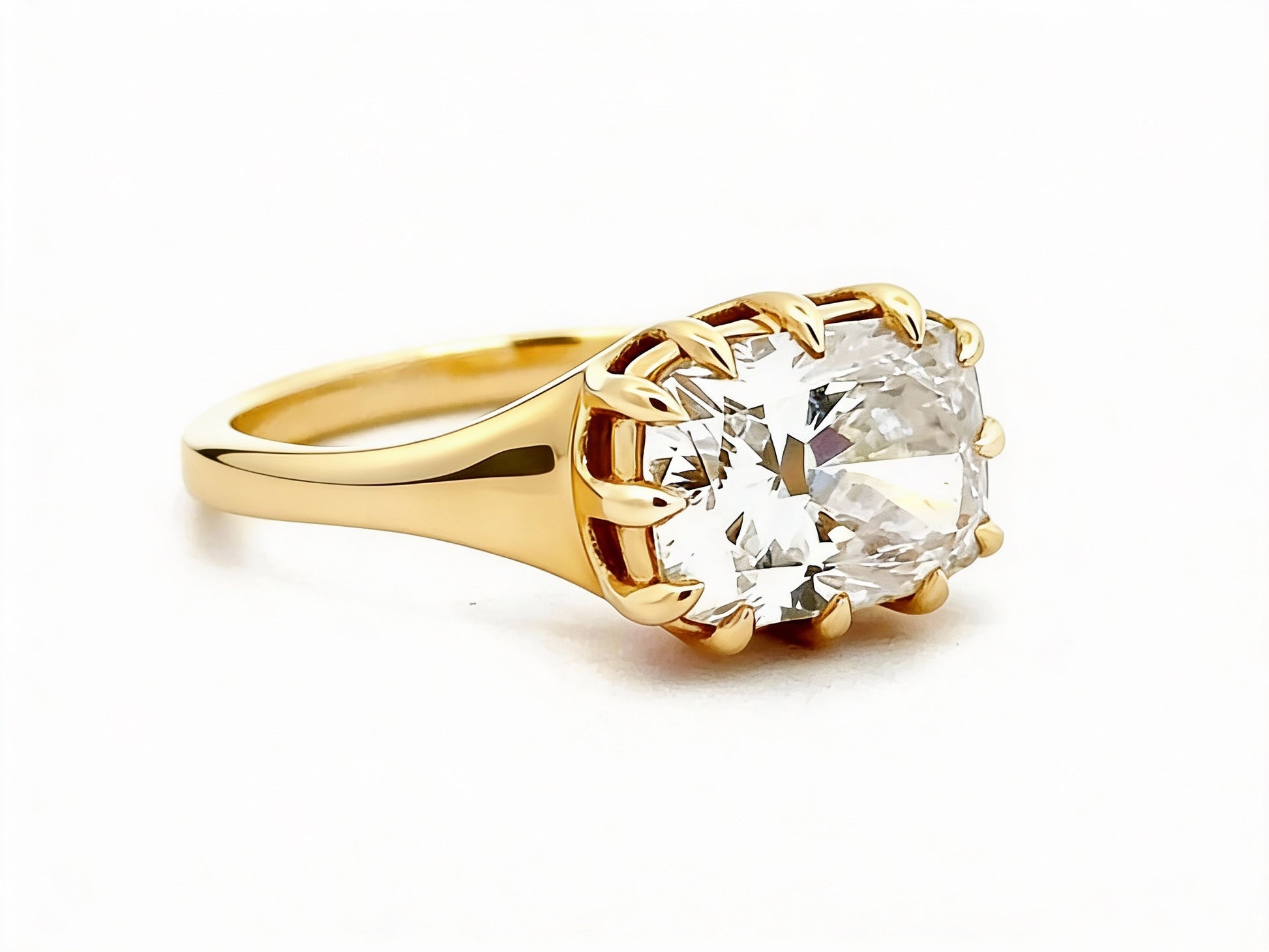 Shown here is a ring featuring a 2.54 ct cushion brilliant cut lab diamond, graded H color and VS1 clarity. The stone is beautifully secured in a 14k yellow gold basket claw setting, creating a timeless and refined design.