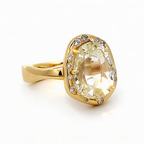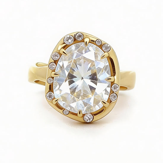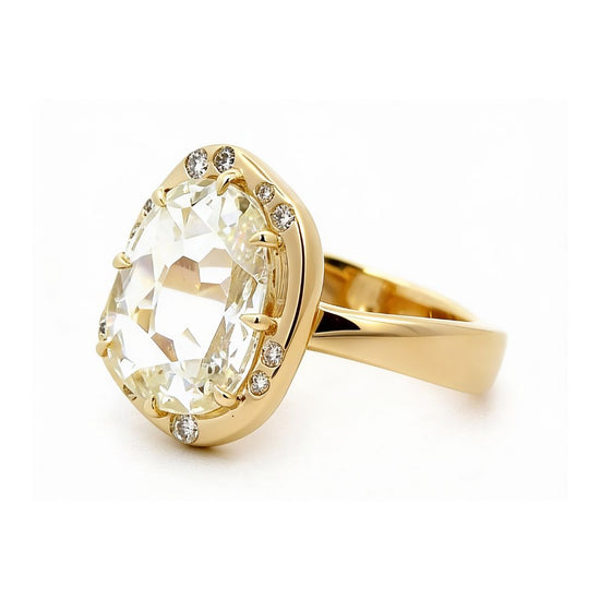 Our Natural Antique Irregular Cushion Cut Diamond Ring features a 3.34 carat (spreads like a 5 carat) H/I color, VS1 clarity center diamond, surrounded by .10 ctw H color, VS clarity natural brilliant cut diamonds and set in 14k yellow gold and weighing 7 grams. This unique antique design celebrates the beauty of irregular diamonds and heirloom-quality craftsmanship, making it a piece to cherish for generations.