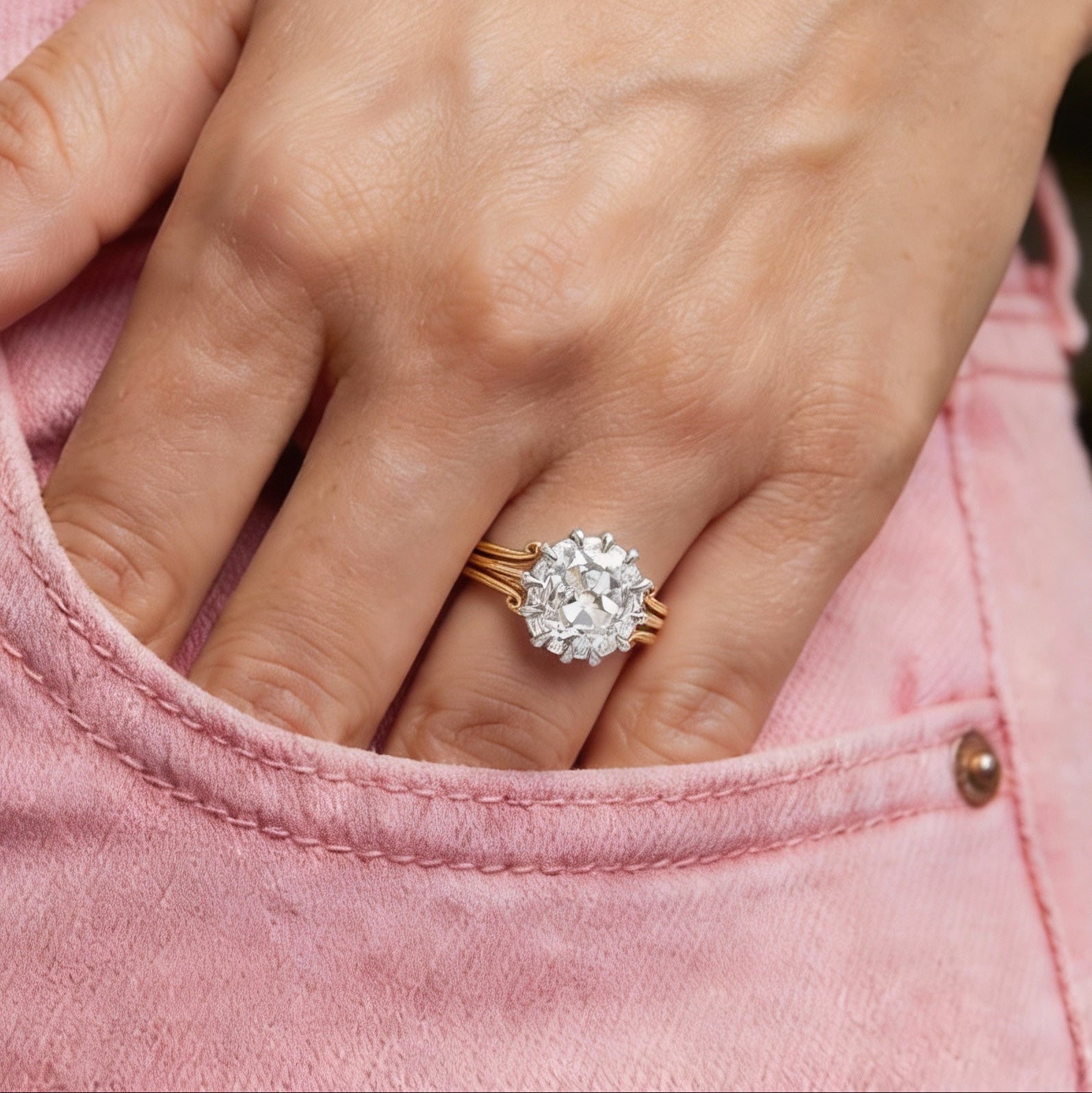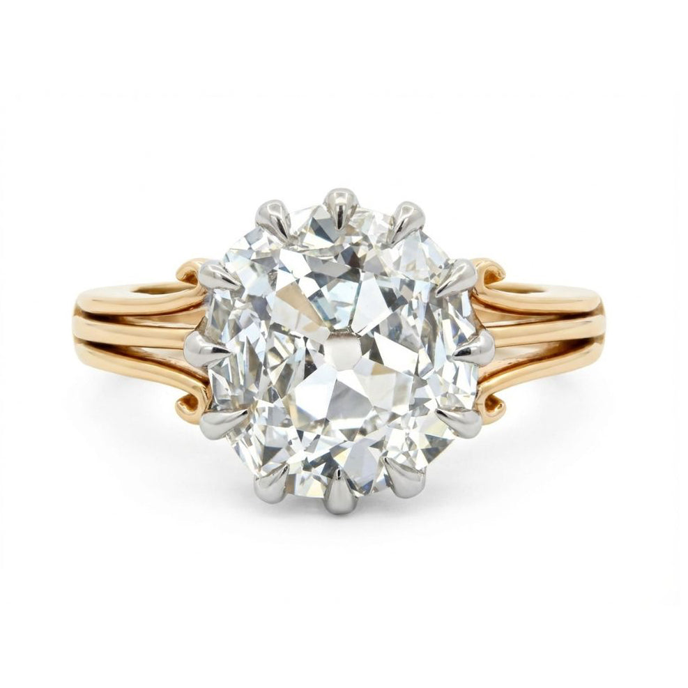 Make a statement with this unique 3.01-carat Irregular Old Mine Cushion Cut ring! Featuring an E-color, VS-clarity manmade diamond, it’s set in 2.33 grams of 14k white gold and 3.45 grams of 18k yellow gold—for a total gold weight of 5.78 grams.