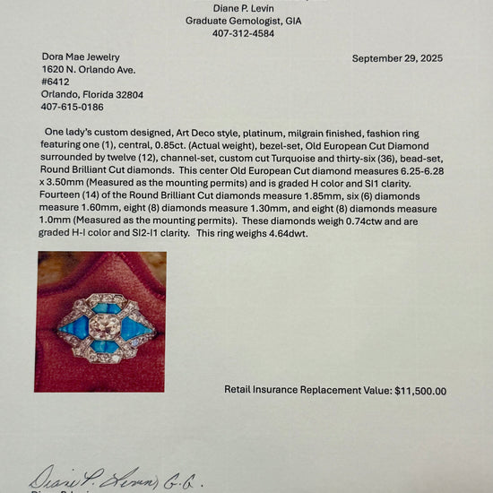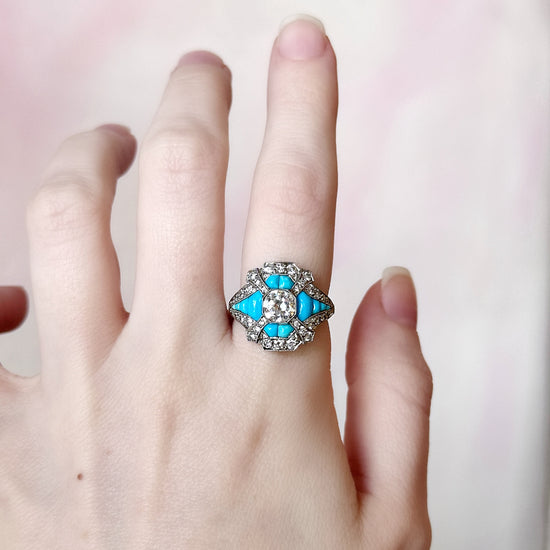 Our 1920s Art Deco hand-cut turquoise and diamond statement ring captures the bold geometry and glamour of the era. Featuring approximately 1.93 carats total weight, the carefully set turquoise and sparkling diamonds create a striking contrast, embodying the distinctive sophistication and artistic flair of Art Deco design.