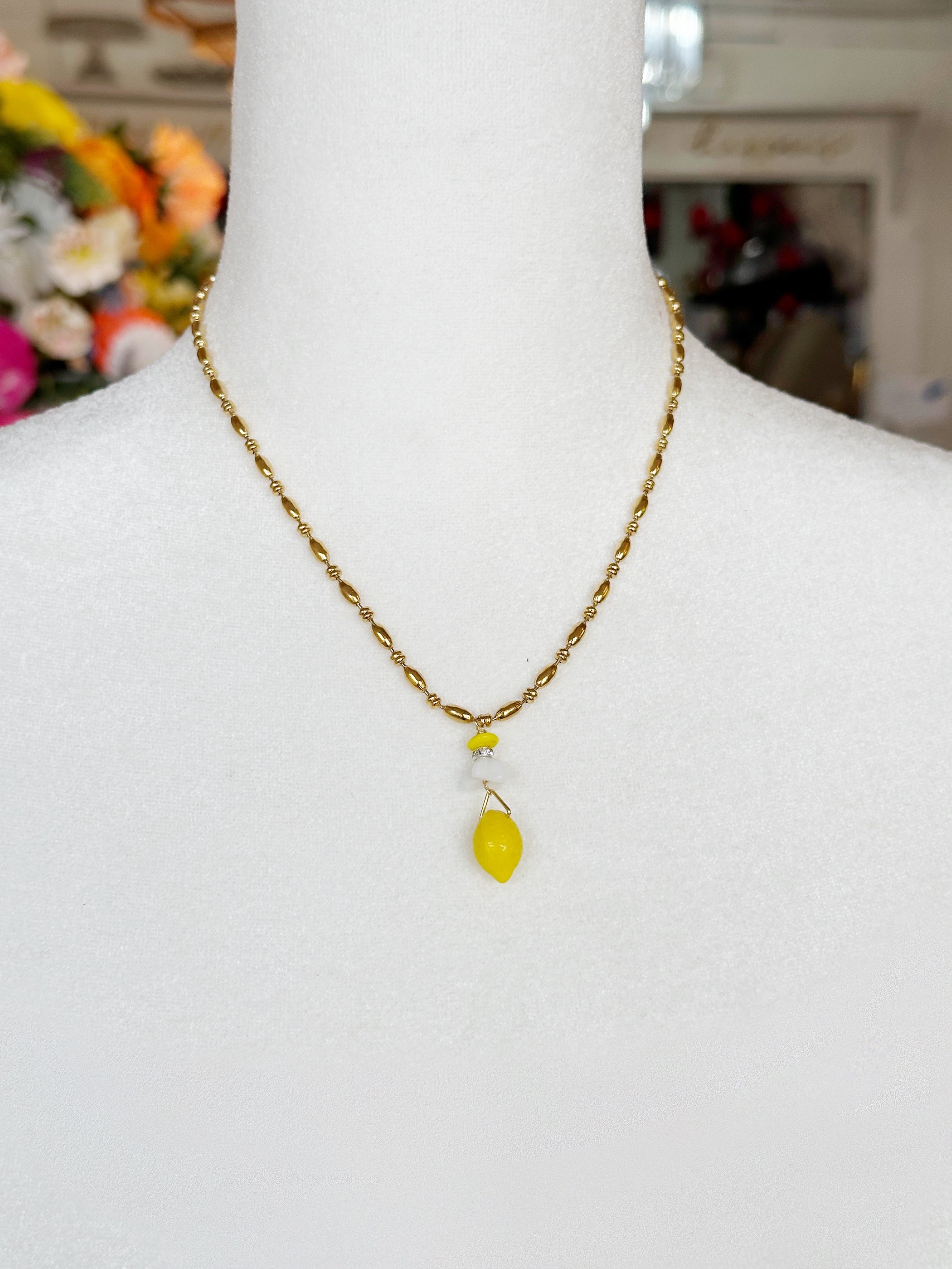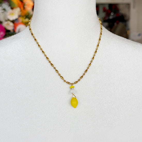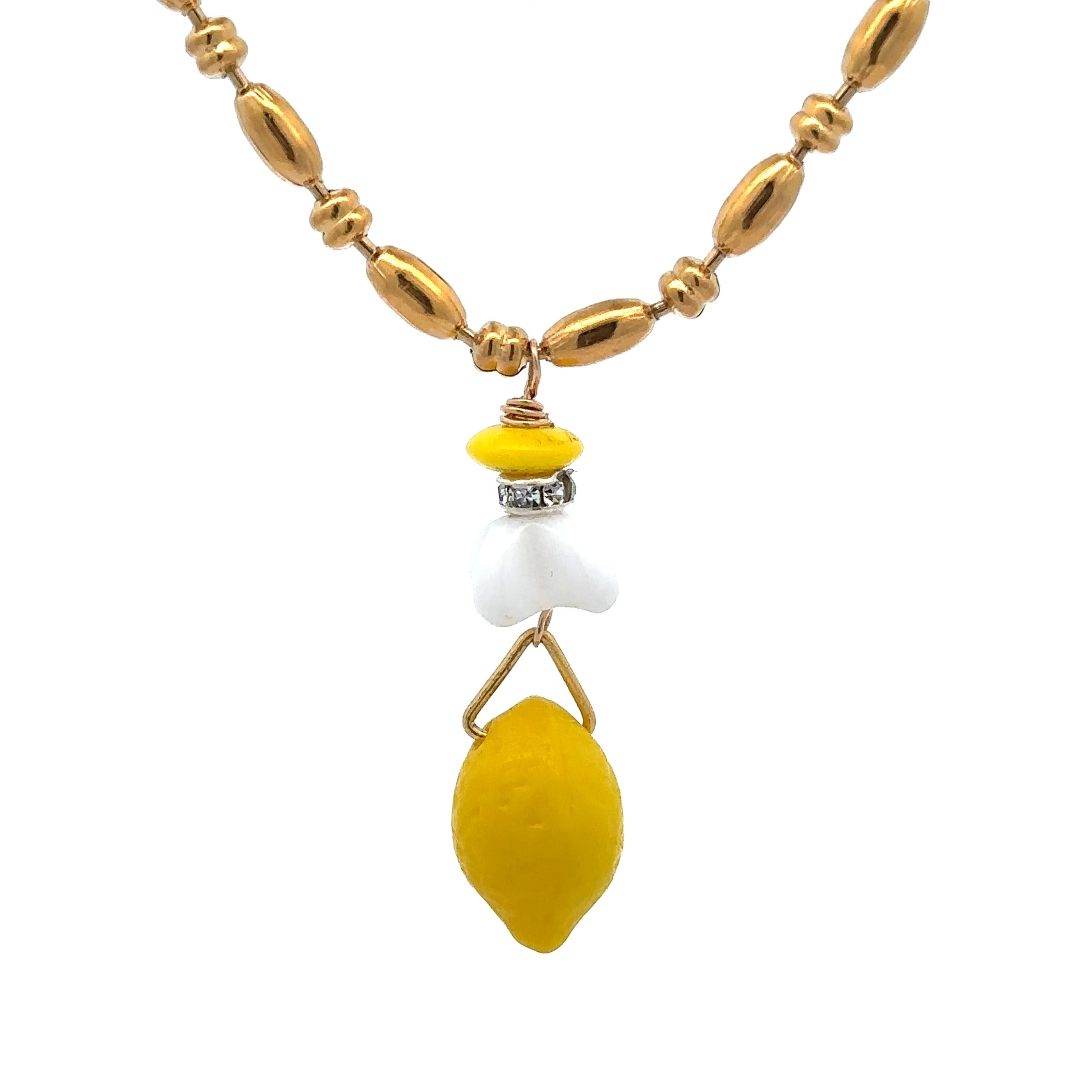 This 1980's lemon charm hung from tarnish free gold chain is the perfect delicate and colorful addition to your wardrobe.