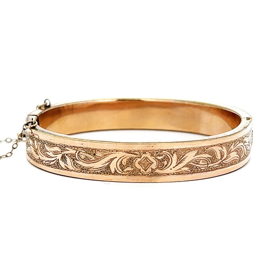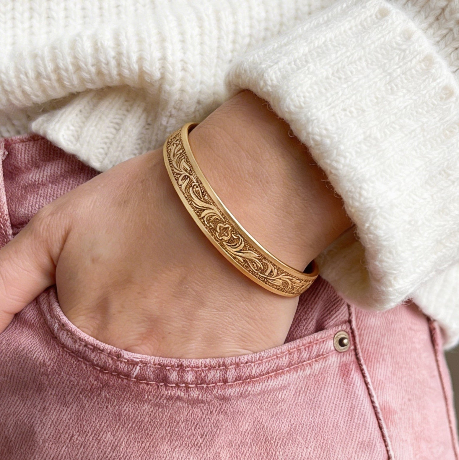 When you go gold, you go bold! Allow yourself to be fully seen in this turn of the century 14k gold-filled bangle bracelet with a beautiful, hand etched abstract design!