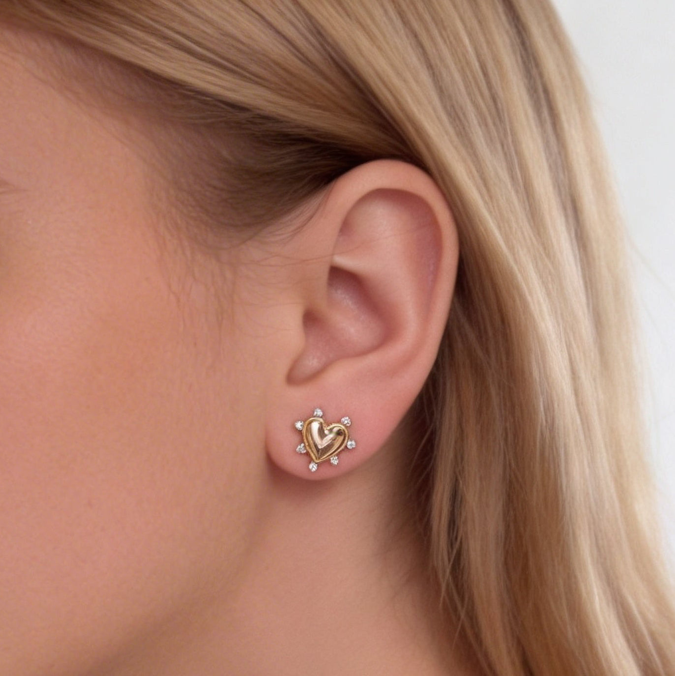 A pair of 14k yellow gold heart-shaped stud earrings (1.25 grams) featuring diamonds surrounding each heart, totaling 0.110 carats, F color, SI1 clarity. Delicate, charming, and perfect for adding a touch of sparkle to your everyday look or layering with other earrings.