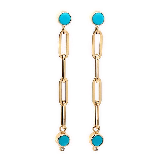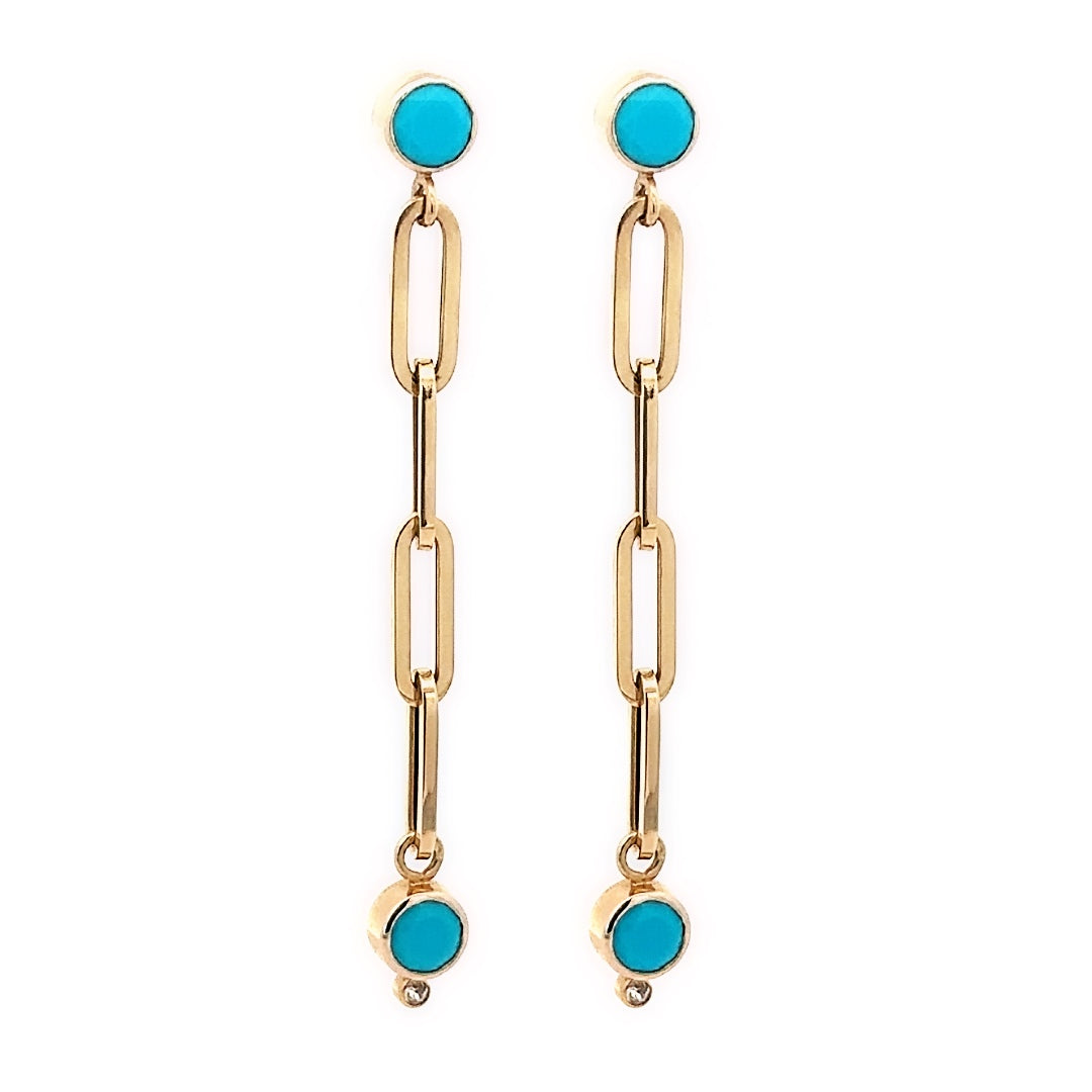 Add a pop of color and sparkle with these Turquoise Diamond Drop Earrings! Crafted in 5 grams of 14k yellow gold, they feature natural turquoise stones paired with sparkling diamonds on paperclip chain—perfect for everyday wear or special occasions.