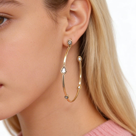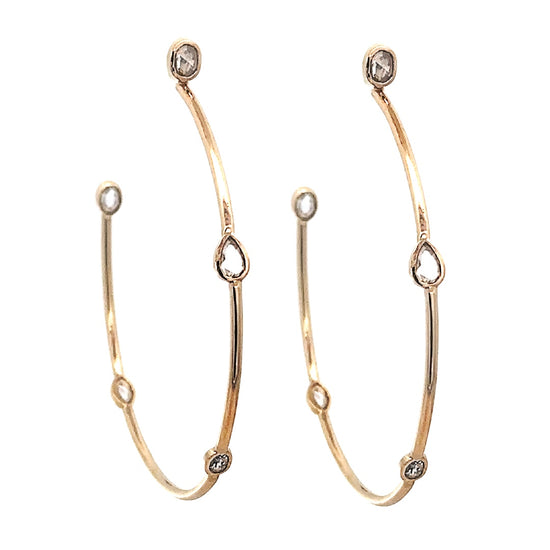"Harkeness" in her classic form is a pair of front-facing hoops crafted in 14k yellow gold and weighing 5.5 grams, set with 10 rose-cut diamonds totaling approximately 1 carat in H/J color and VS clarity. A brilliant, modern silhouette that offers perfect sparkle from every angle.