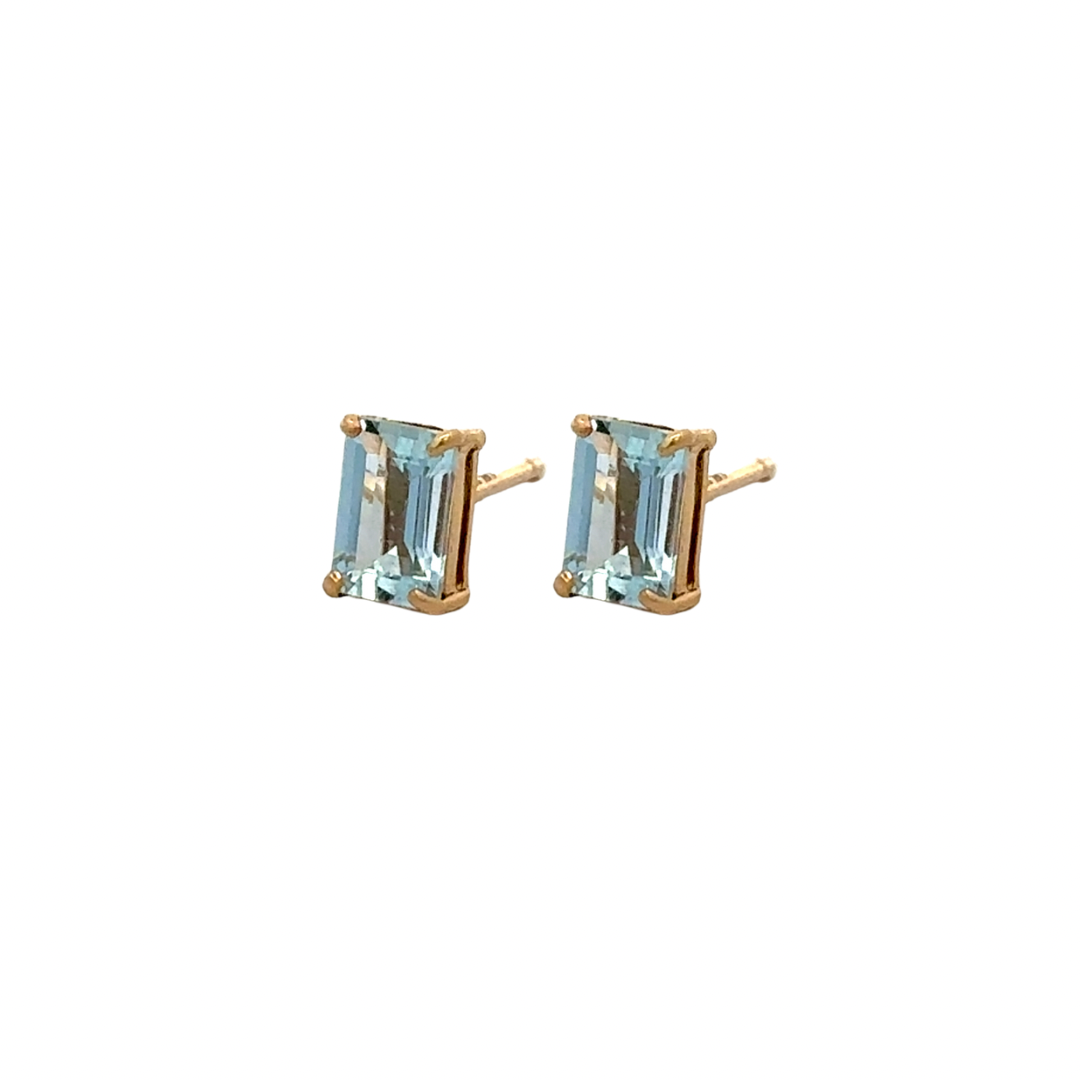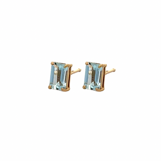 Emerald-cut aquamarine stud earrings set in 14k yellow gold, featuring 5.5 carats total weight of icy blue aquamarines. Clean, classic, and full of light—these studs bring a fresh pop of color to any look.