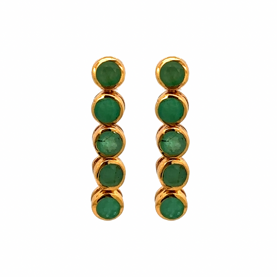 Natural emerald bezel-set drop earrings in 925 sterling silver with 22k gold vermeil, designed to be tarnish-free. Featuring vibrant green emeralds in a clean, minimal setting, these 1" drops bring effortless color and movement.