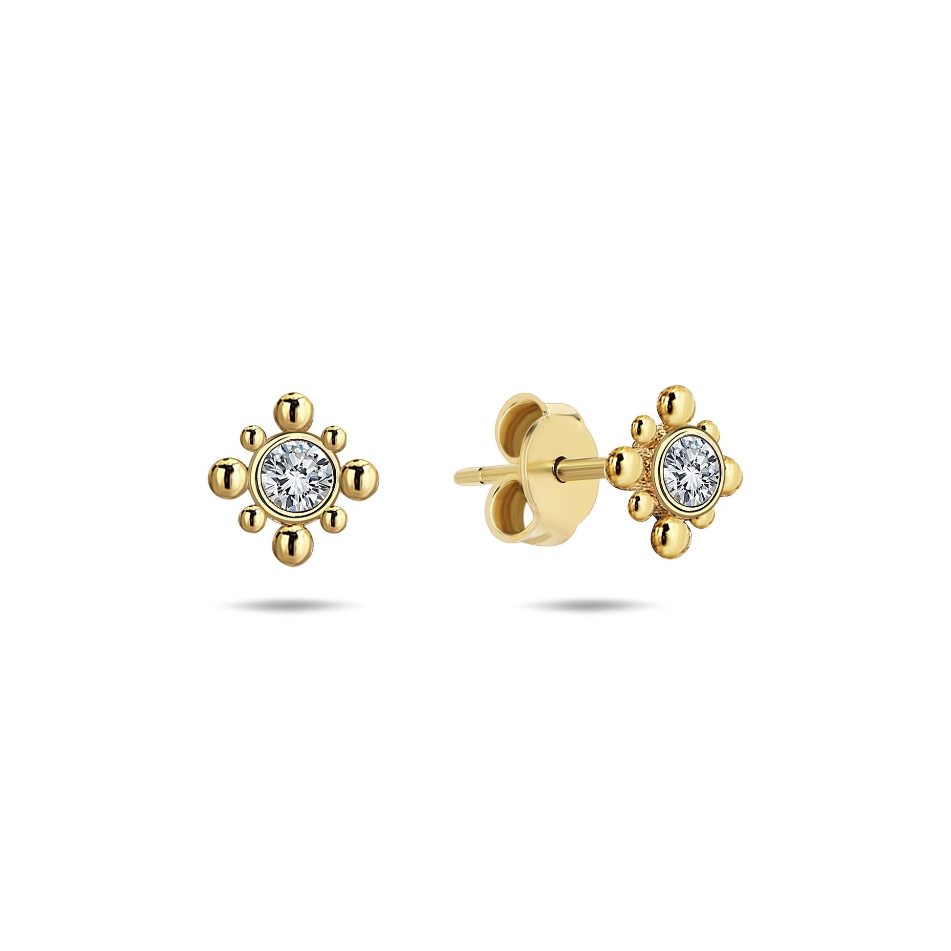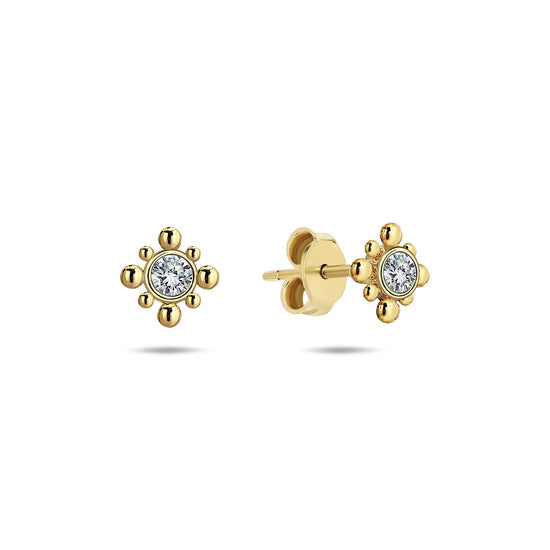 A pair of 14k yellow gold earrings (0.70 grams) featuring 0.060 carats of F color, SI1 clarity diamonds in a fun, playful design. Delicate, stylish, and perfect for adding a subtle sparkle to your everyday look.