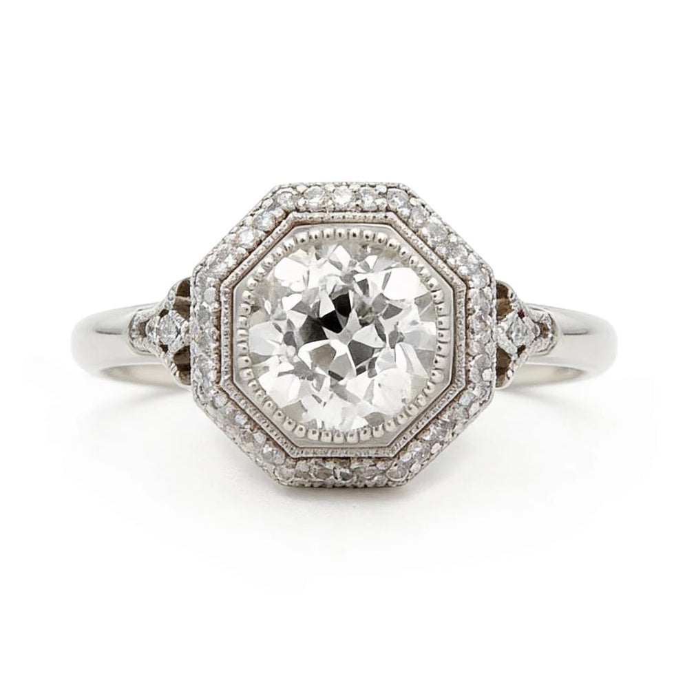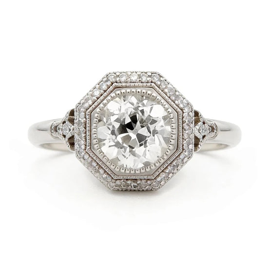 A platinum ring featuring a 2.21-carat Old European cut center diamond with J color and SI1 clarity, accented by 0.18 carats of surrounding diamonds. Weighing 6.17 grams. Thoughtfully designed to highlight antique craftsmanship and the beauty of this hand-cut diamond!