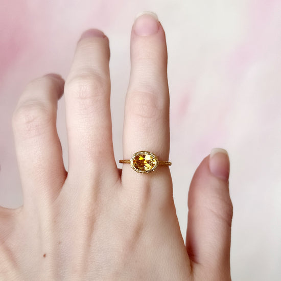 A 14k yellow gold ring featuring a warm citrine, handcrafted in 2 grams of gold and finished with intricate hand engraving. Can be worn alone or stacked with other bands!