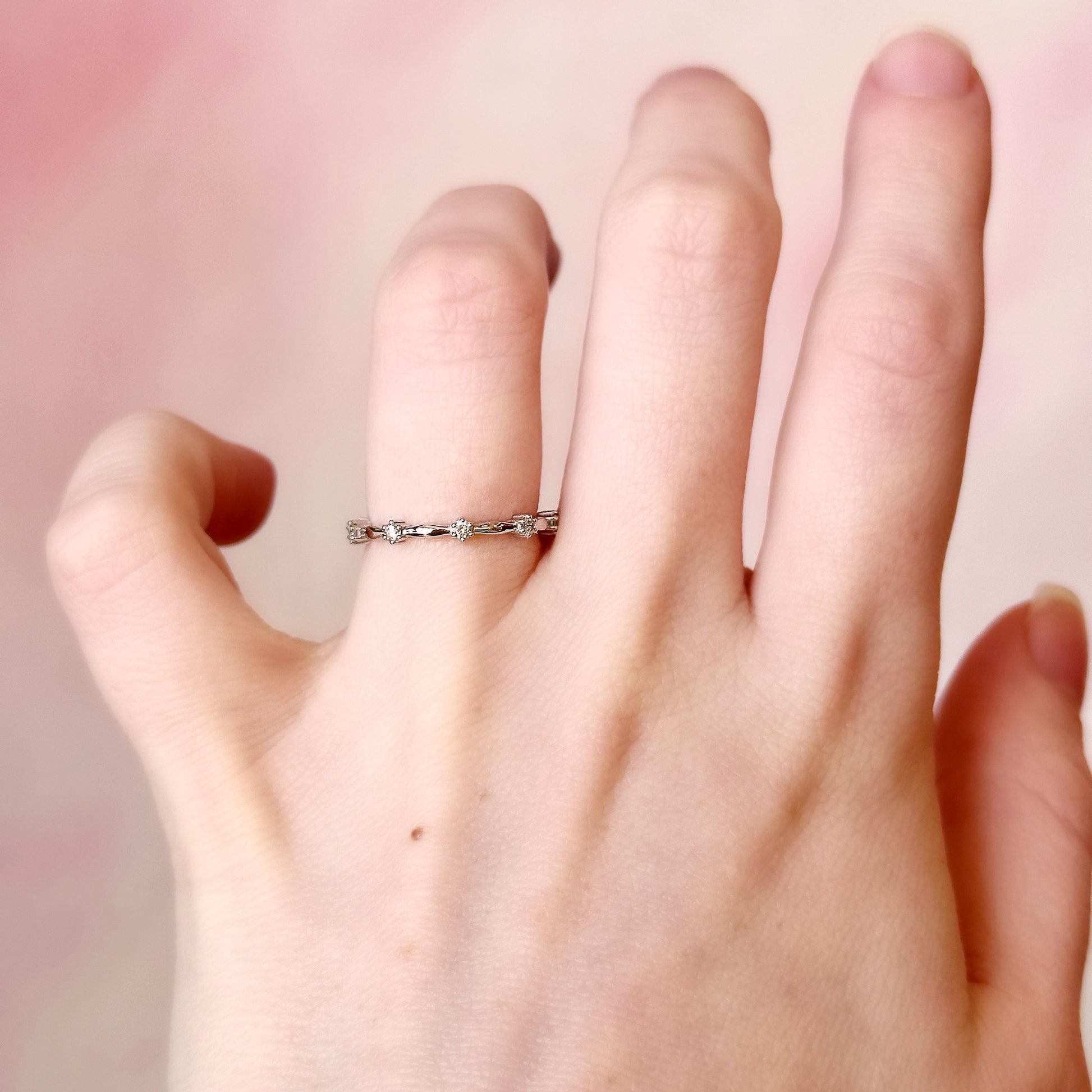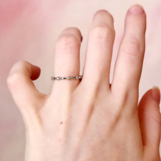 "Phoebe" in her classic form is a 14k white gold station eternity band (1.10 grams) featuring 0.220 carats of F color, SI1 clarity diamonds. Delicate and timeless, this ring adds a subtle sparkle to your everyday look and is perfect for stacking or wearing alone!