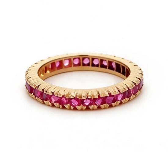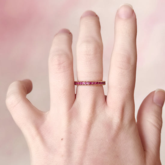 A 1920s pink ruby eternity band crafted in 14k gold. A timeless piece that wears beautifully on its own or stacked with other bands.