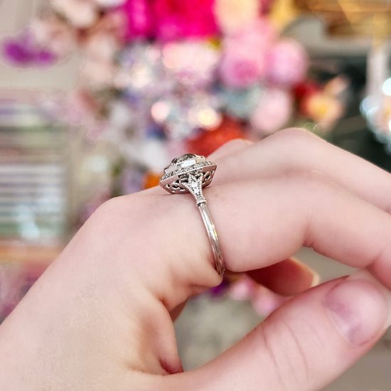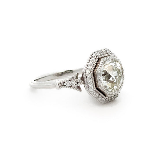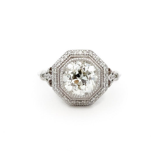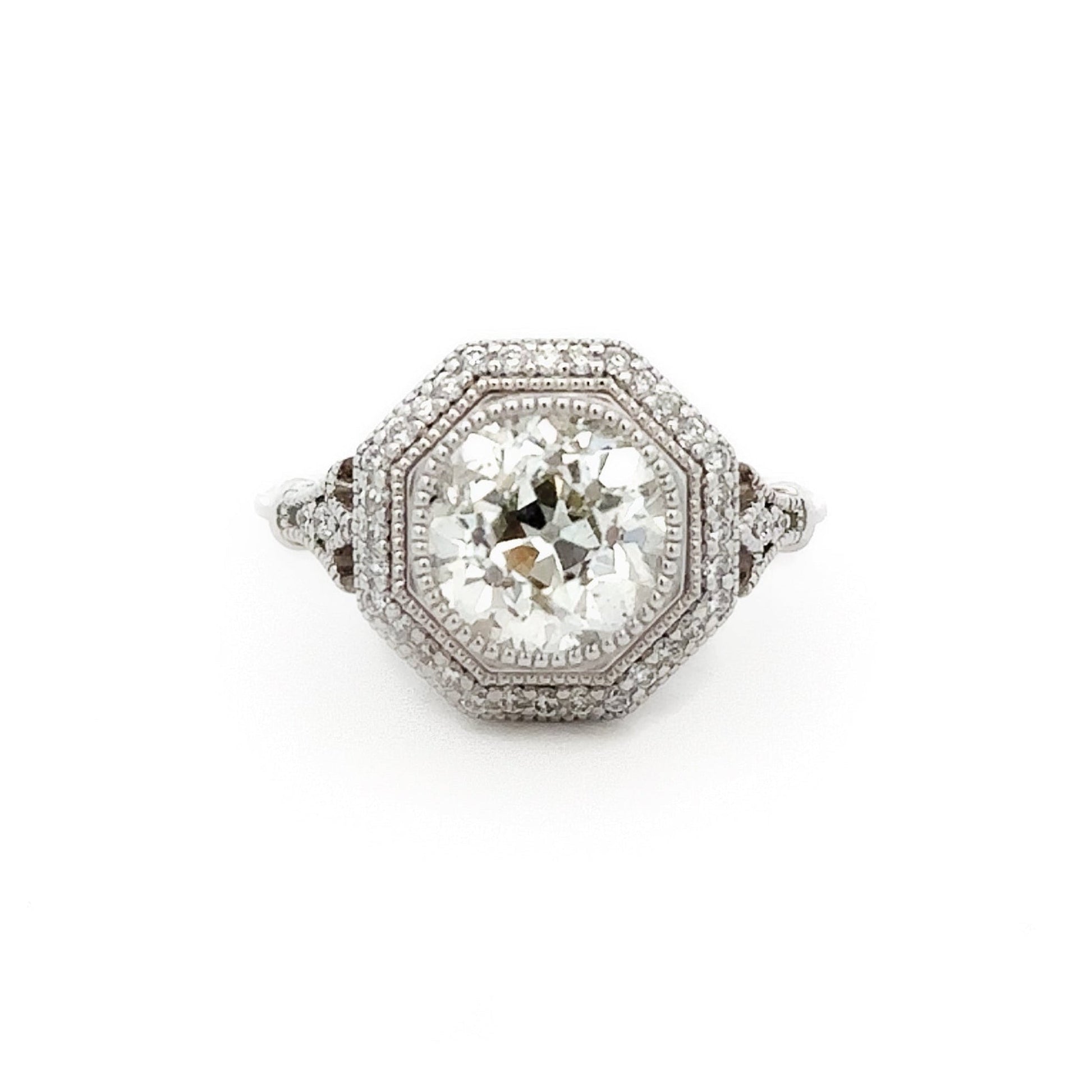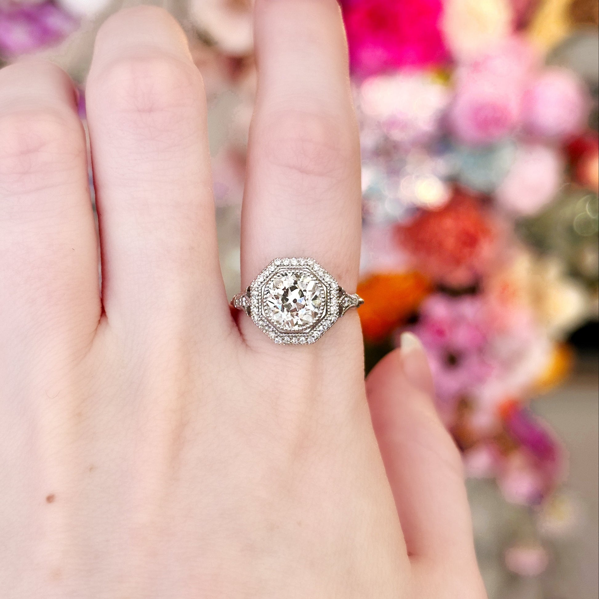 A platinum ring featuring a 2.21-carat Old European cut center diamond with J color and SI1 clarity, accented by 0.18 carats of surrounding diamonds. Weighing 6.17 grams. Thoughtfully designed to highlight antique craftsmanship and the beauty of this hand-cut diamond!