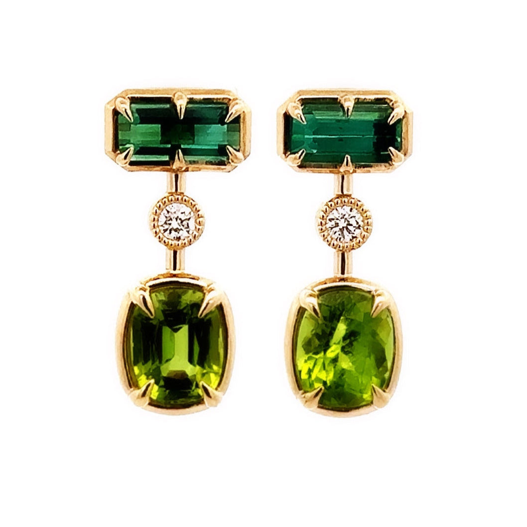 Add a pop of color to your look with these 14k yellow gold asymmetrical earrings! Featuring 2.82 carats of natural peridot, 1.13 carats of natural tourmaline, and 0.116 carats of sparkling natural diamonds, they’re a vibrant, eye-catching pair.