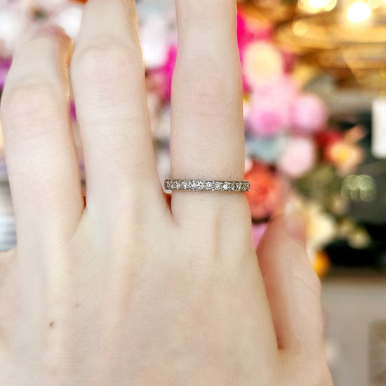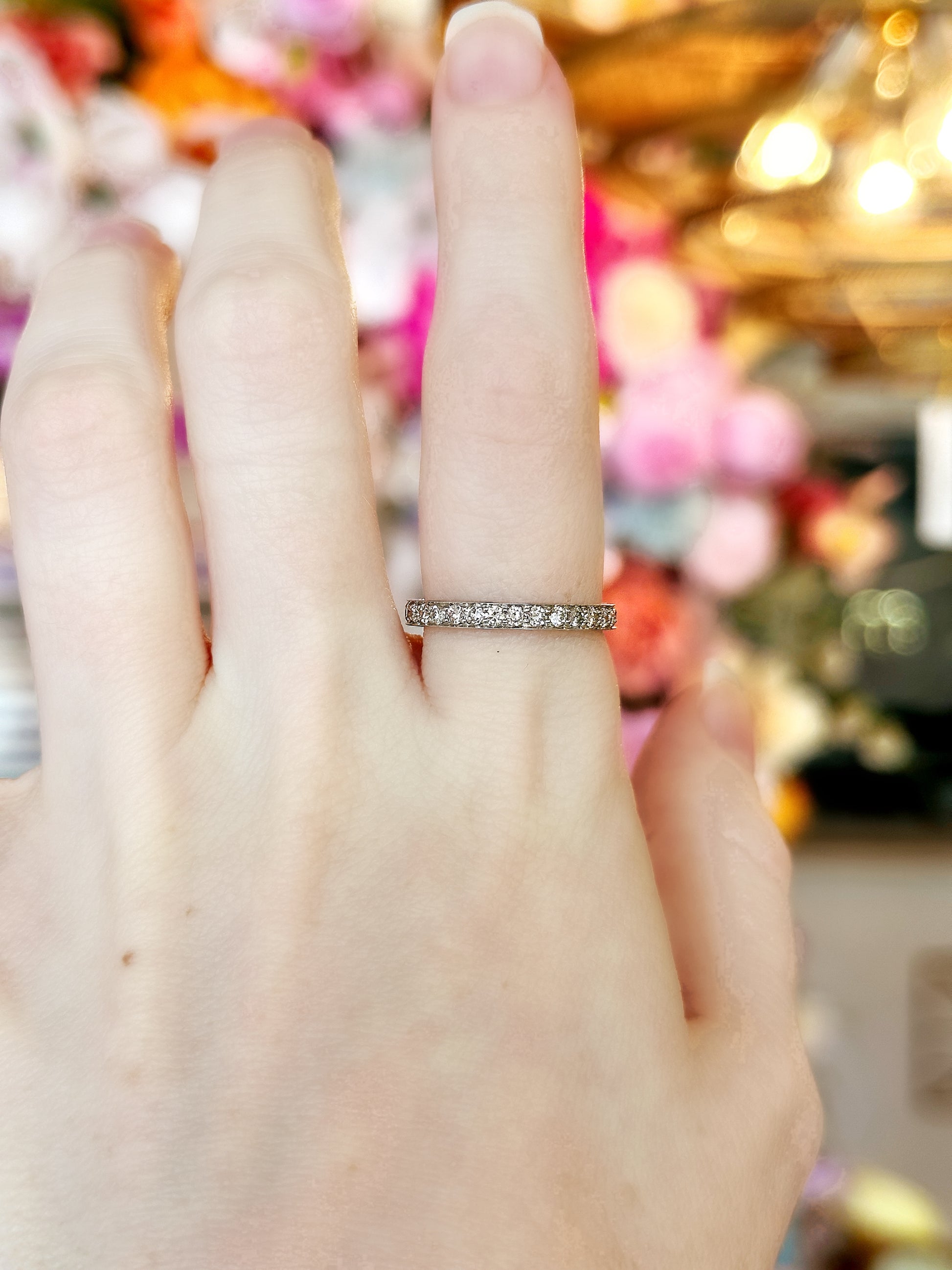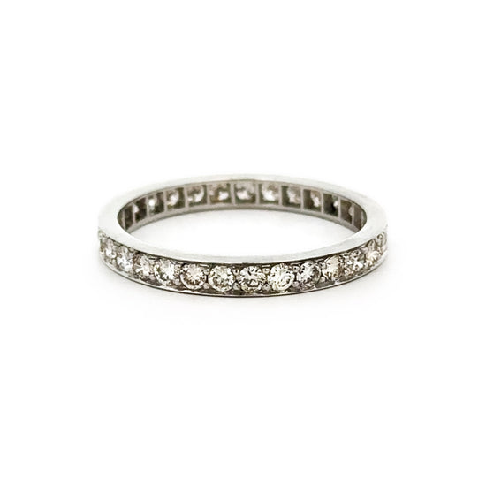 A 1920's platinum eternity band set with full-cut diamonds totaling approximately 1.20 carats. Measuring 2.56 mm wide and 1.51 mm high, this ring offers a refined, elegant sparkle—an enduring classic in a sleek platinum setting.