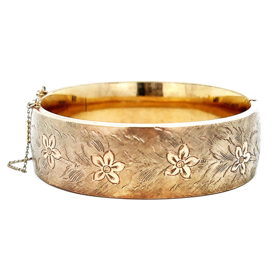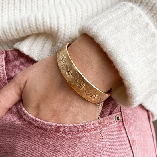 When you go gold, you go bold! Allow yourself to be fully seen in this turn of the century 14k gold-filled bangle bracelet with a beautiful, hand etched floral design!