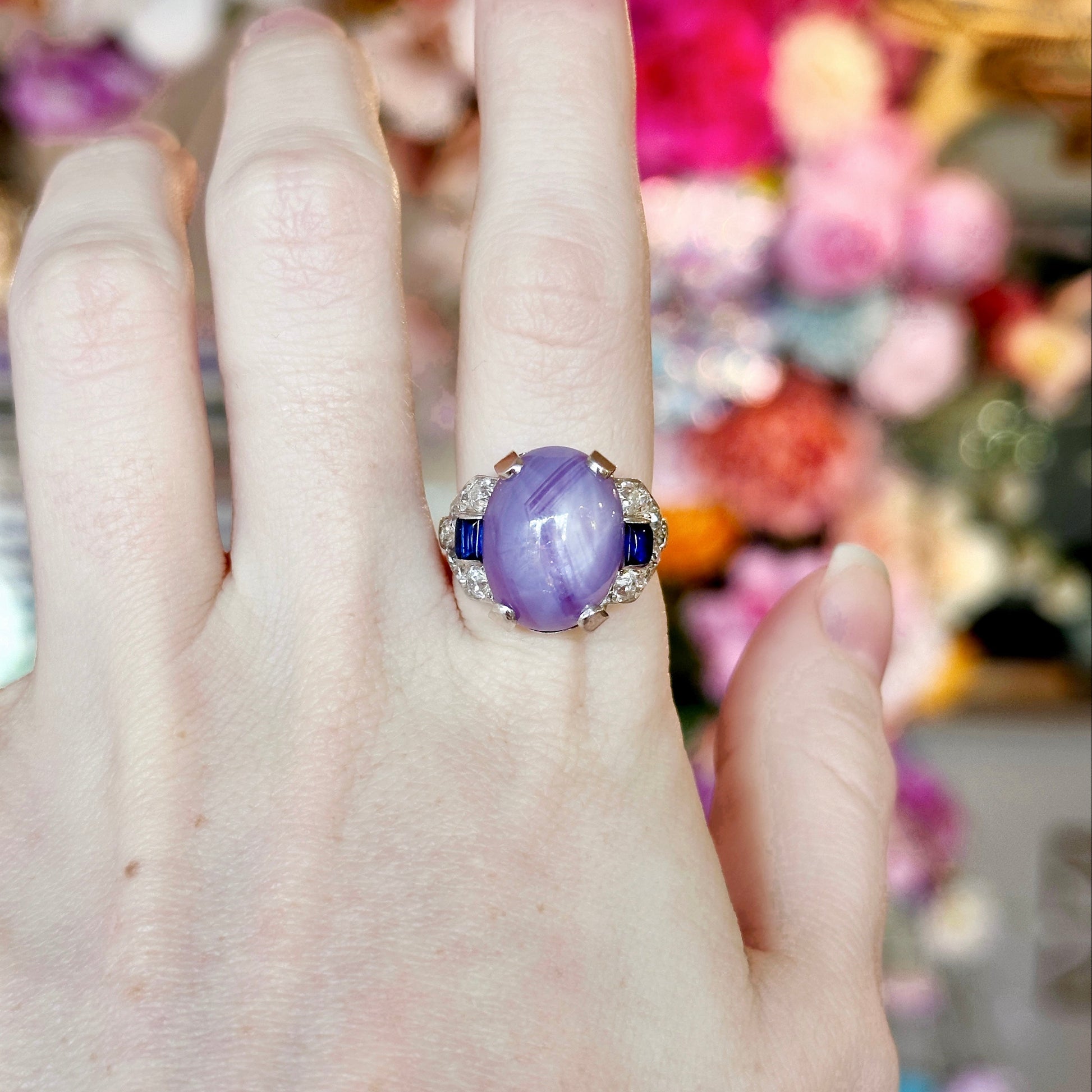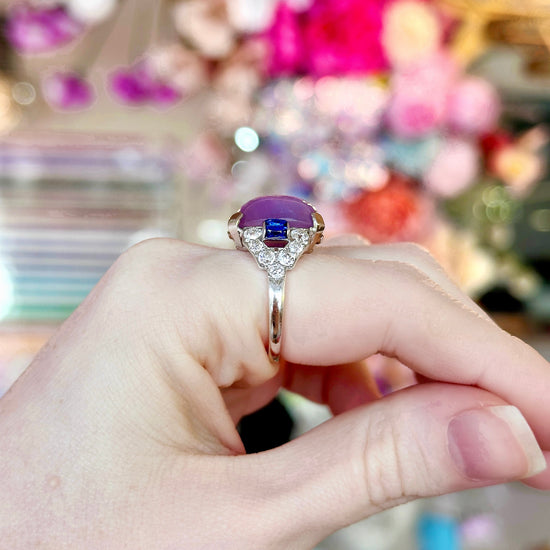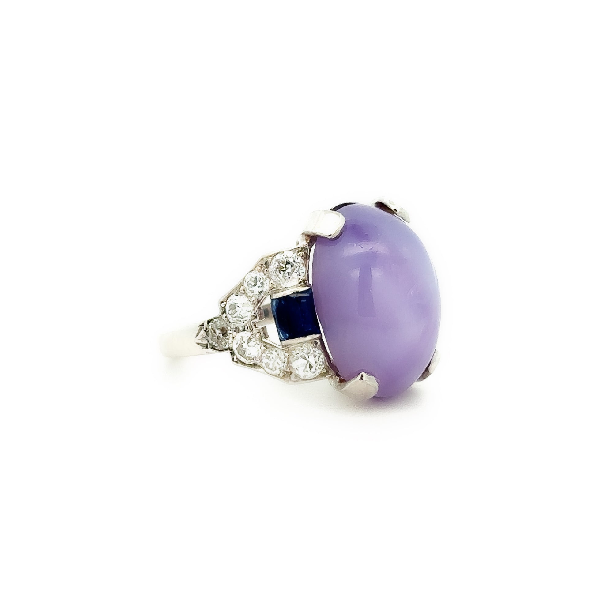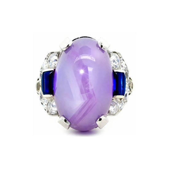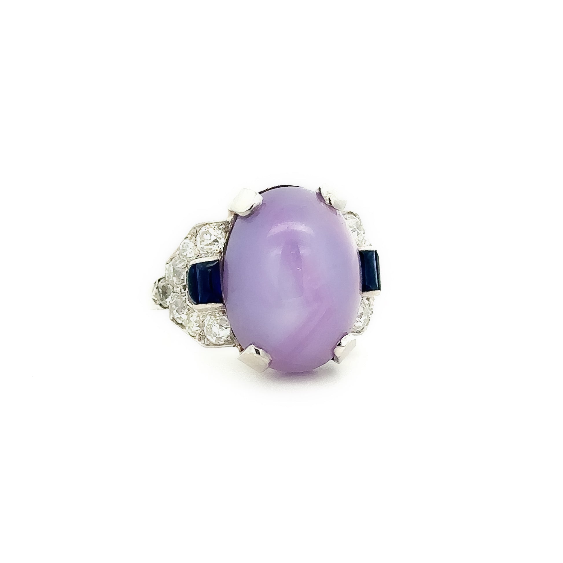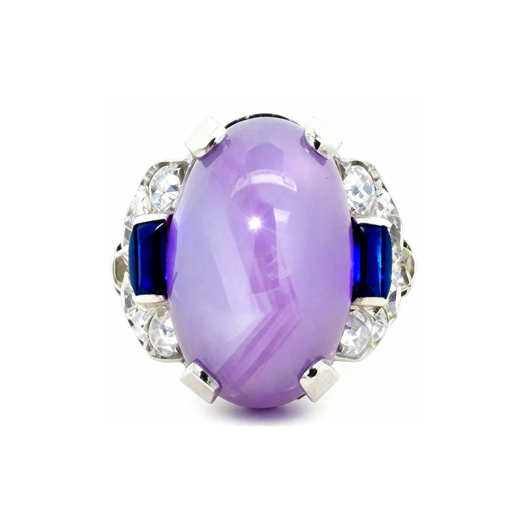 A striking 1930s Art Deco piece featuring a 17.44-carat oval cabochon star sapphire (16.00 x 11.98 x 8.82 mm) of East African origin, with no heat treatment detected. The bold cabochon cut and timeless Art Deco design beautifully showcase the sapphire’s natural depth and elegance — a rare treasure from a bygone era.