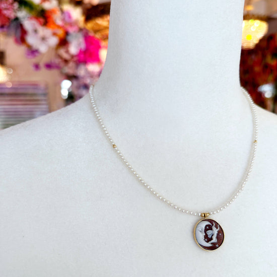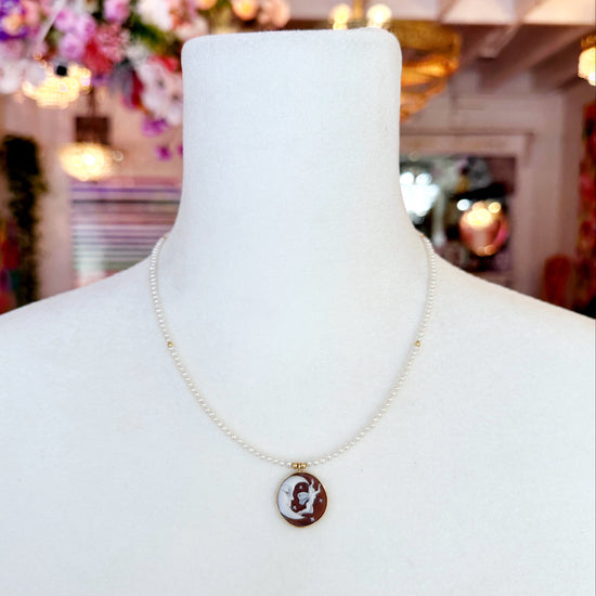 A 1960’s hand-carved Italian cameo set in 18k gold, featuring a delicate crescent and fairy motif that feels straight out of a dream! Elegantly strung on genuine pearls with 18k beaded accents along the necklace, this piece captures a whimsical blend of magic and old-world charm!