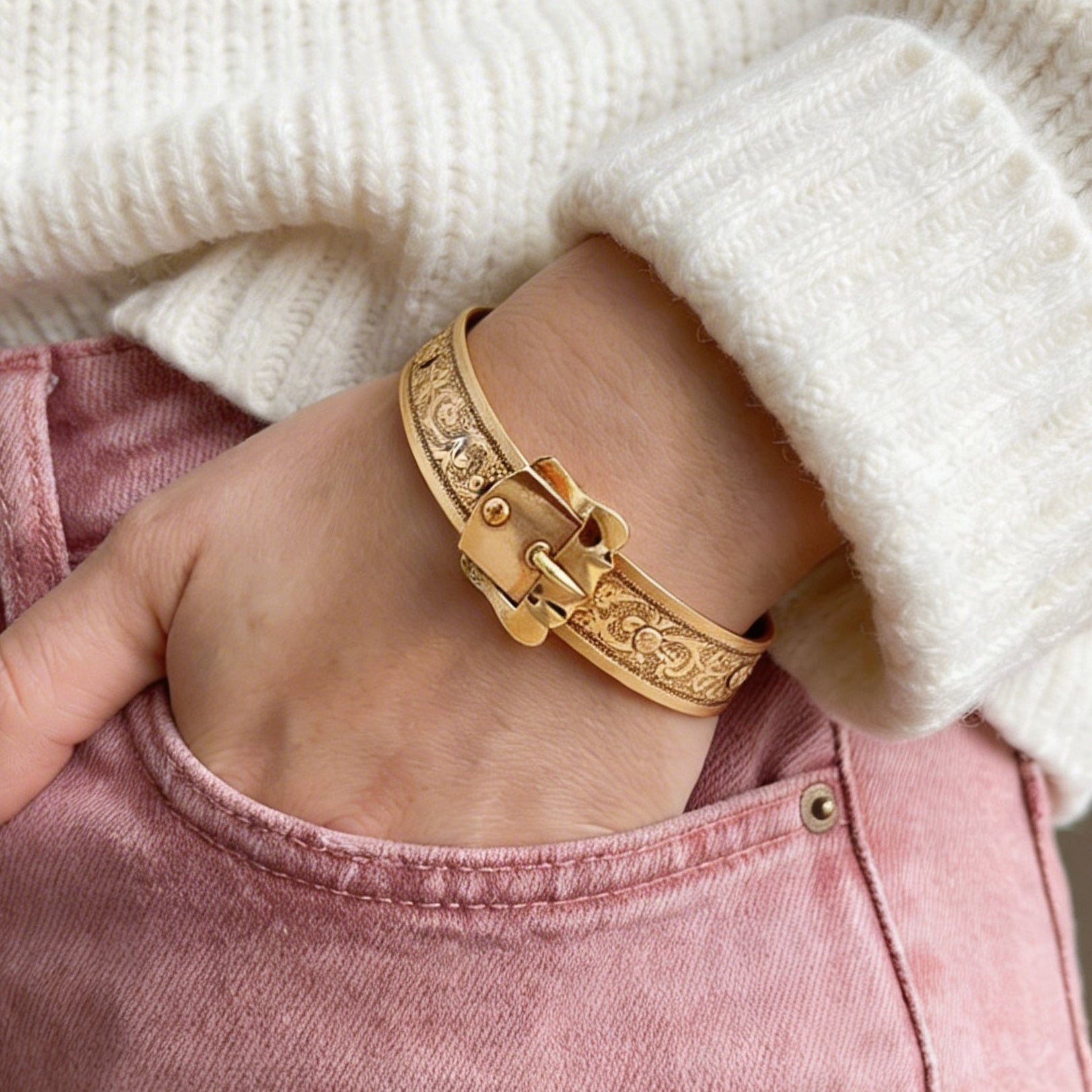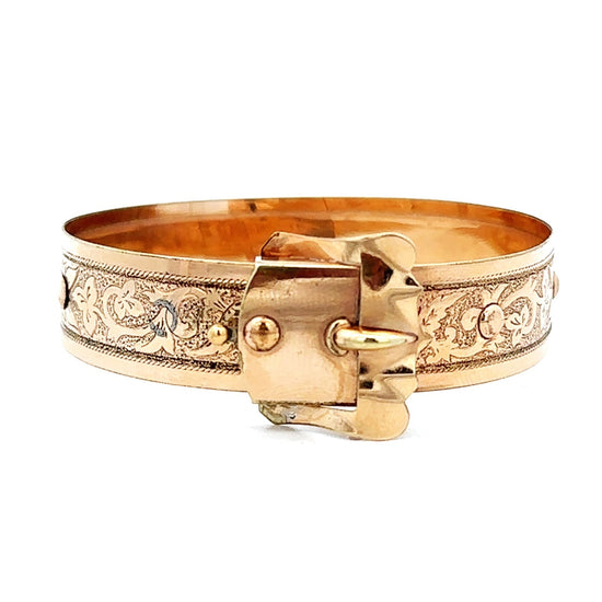 When you go gold, you go bold! Allow yourself to be fully seen in this turn of the century 14k gold-filled buckle bangle bracelet accented with a beautiful, hand etched floral design!