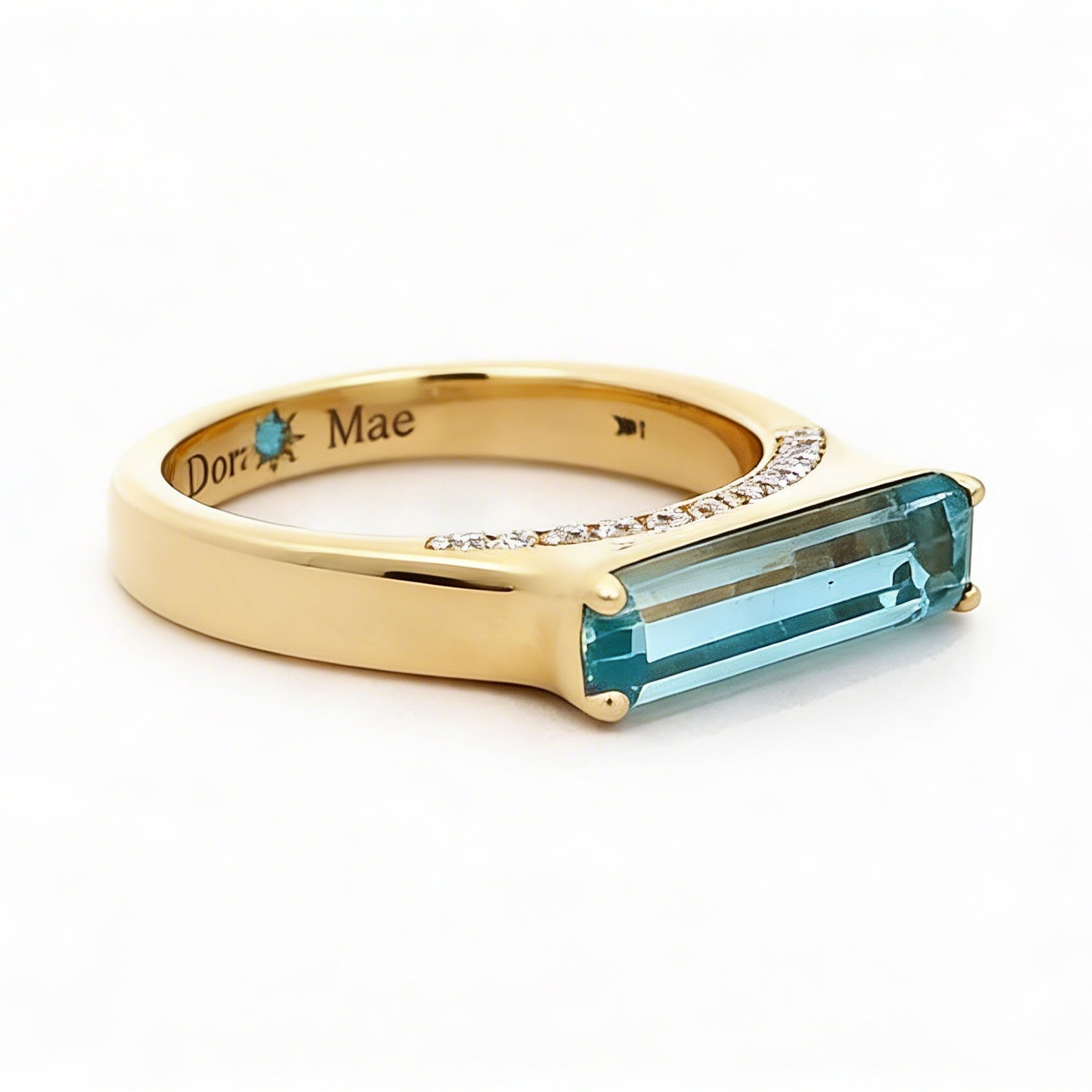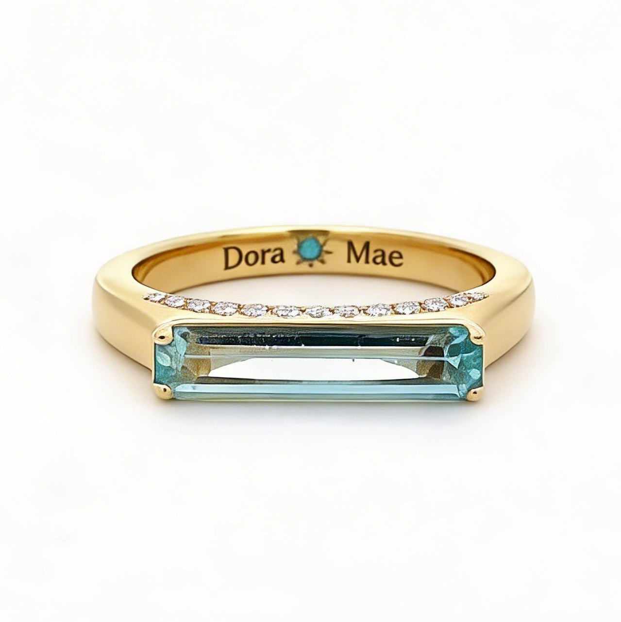 An aquamarine and diamond ring featuring a horizontally set aquamarine accented by natural diamonds, crafted in 14k yellow gold and weighing approximately 5 grams. A modern, balanced design that wears beautifully on its own or stacked with other bands!