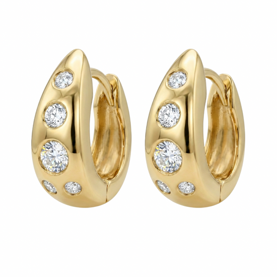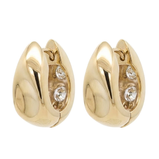 A pair of 14k yellow gold diamond huggie earrings featuring approximately 1 carat of natural diamonds with H color and VS clarity, crafted in solid gold and weighing 8 grams. A versatile, double-sided design that wears well on its own or layered with other earrings.
