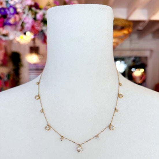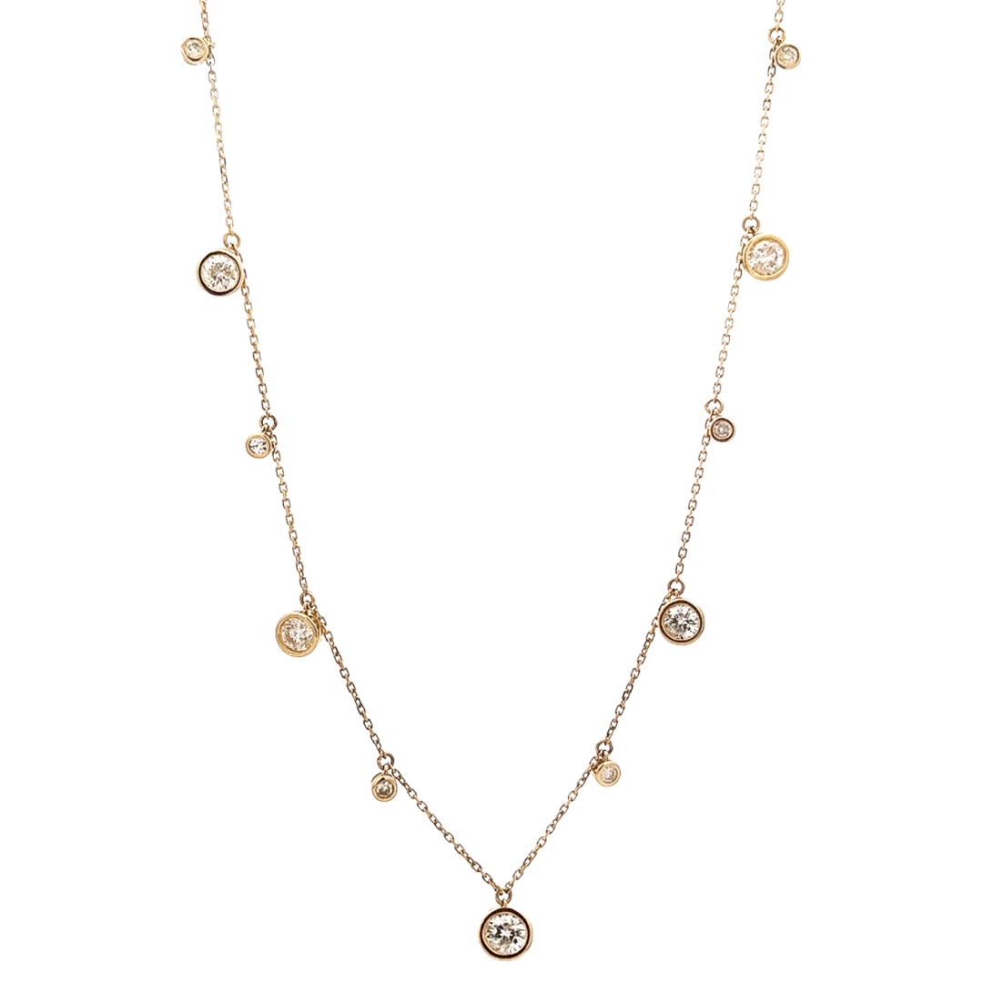 A 14k yellow gold station necklace featuring 1.65 carats of natural diamonds with J color and SI clarity. It’s a stunning statement on its own or a playful addition to any layered look!