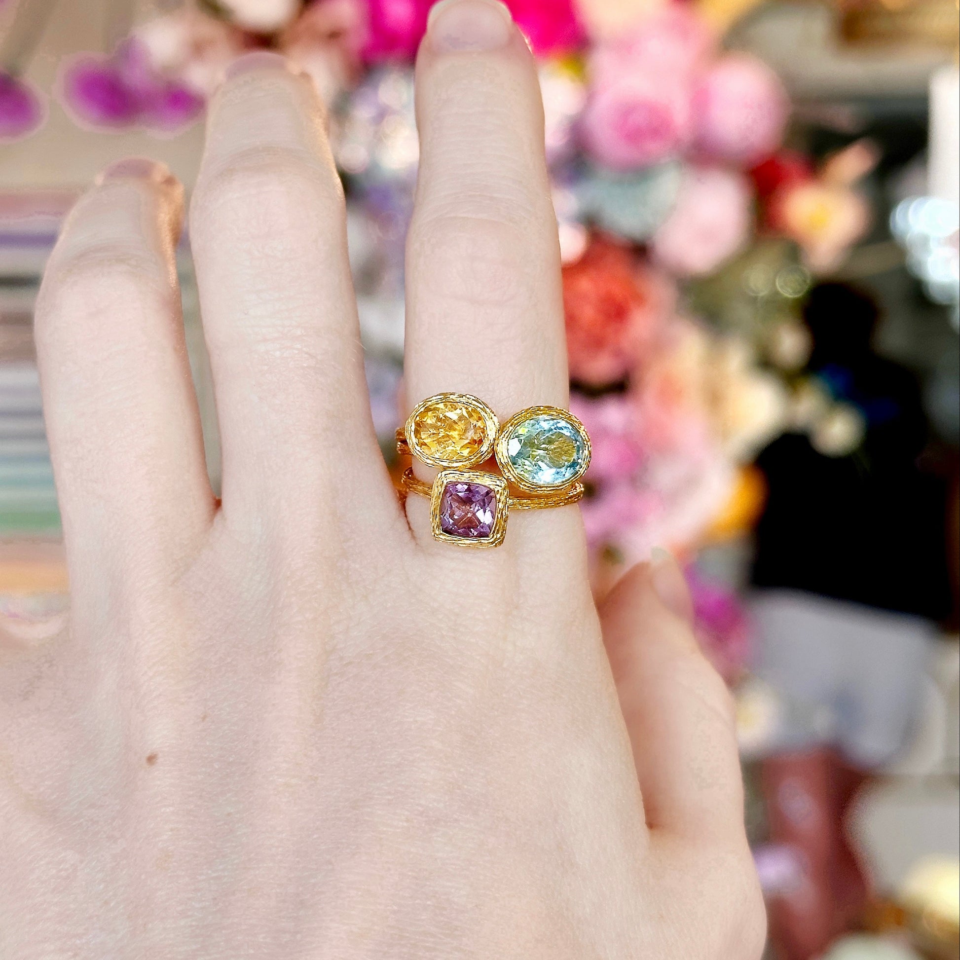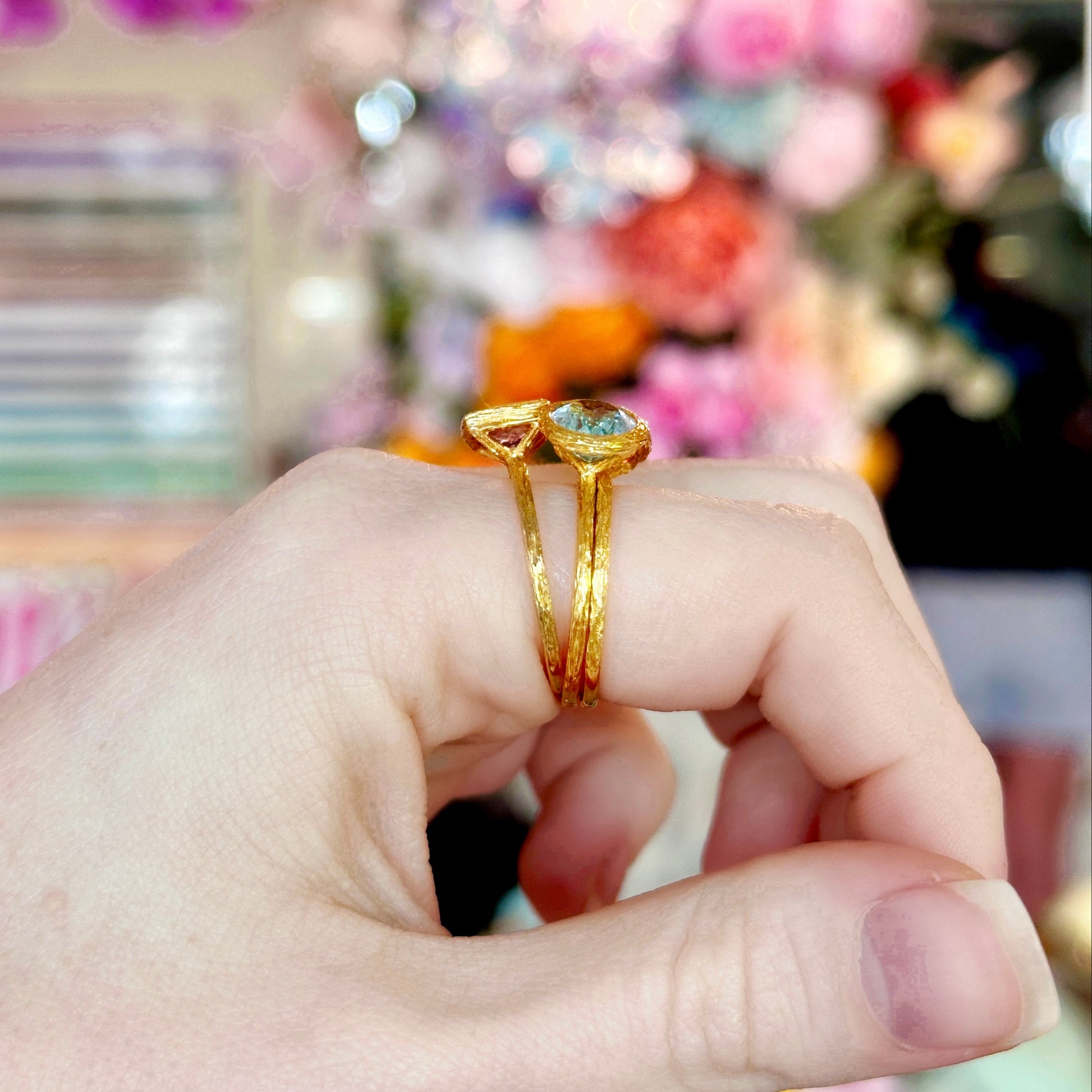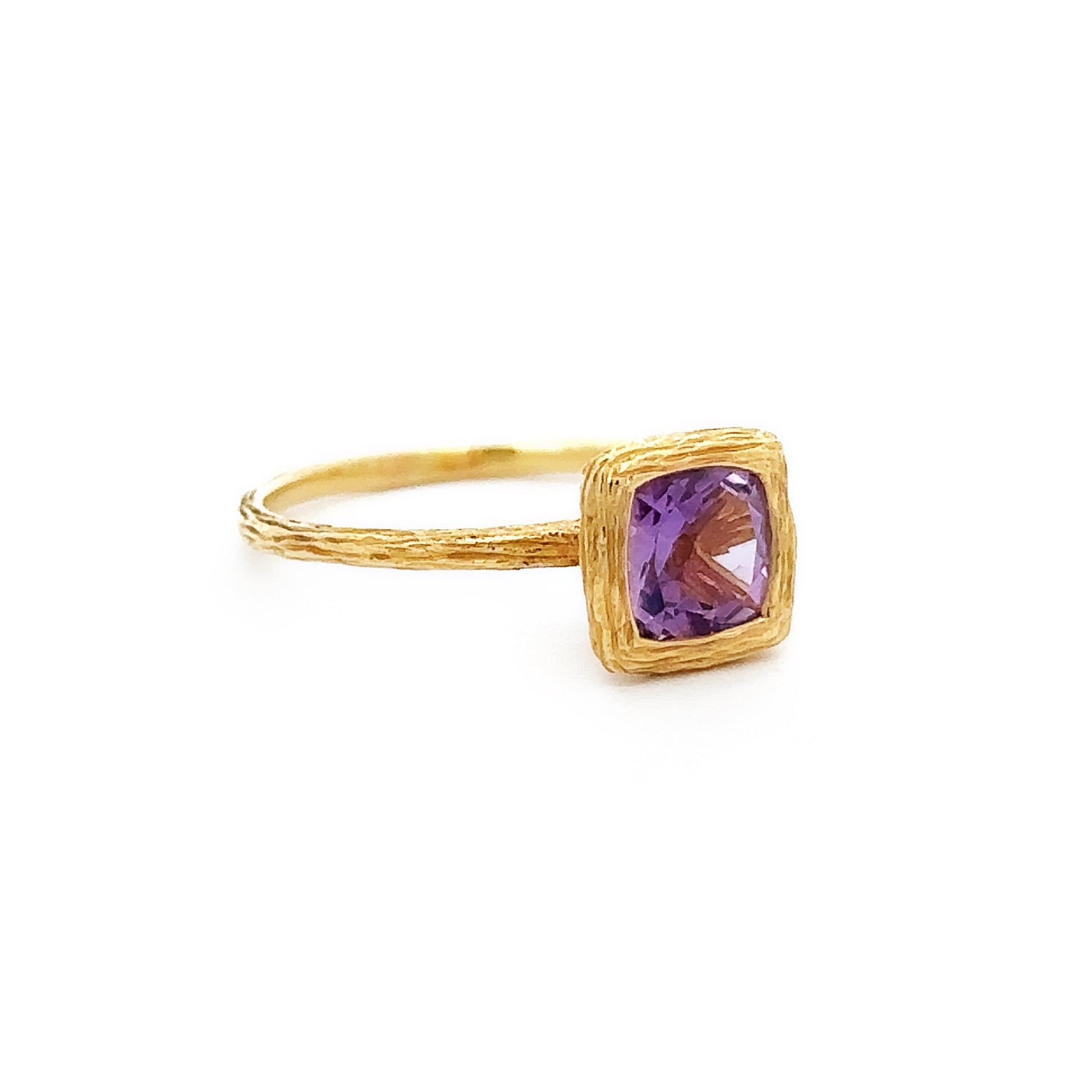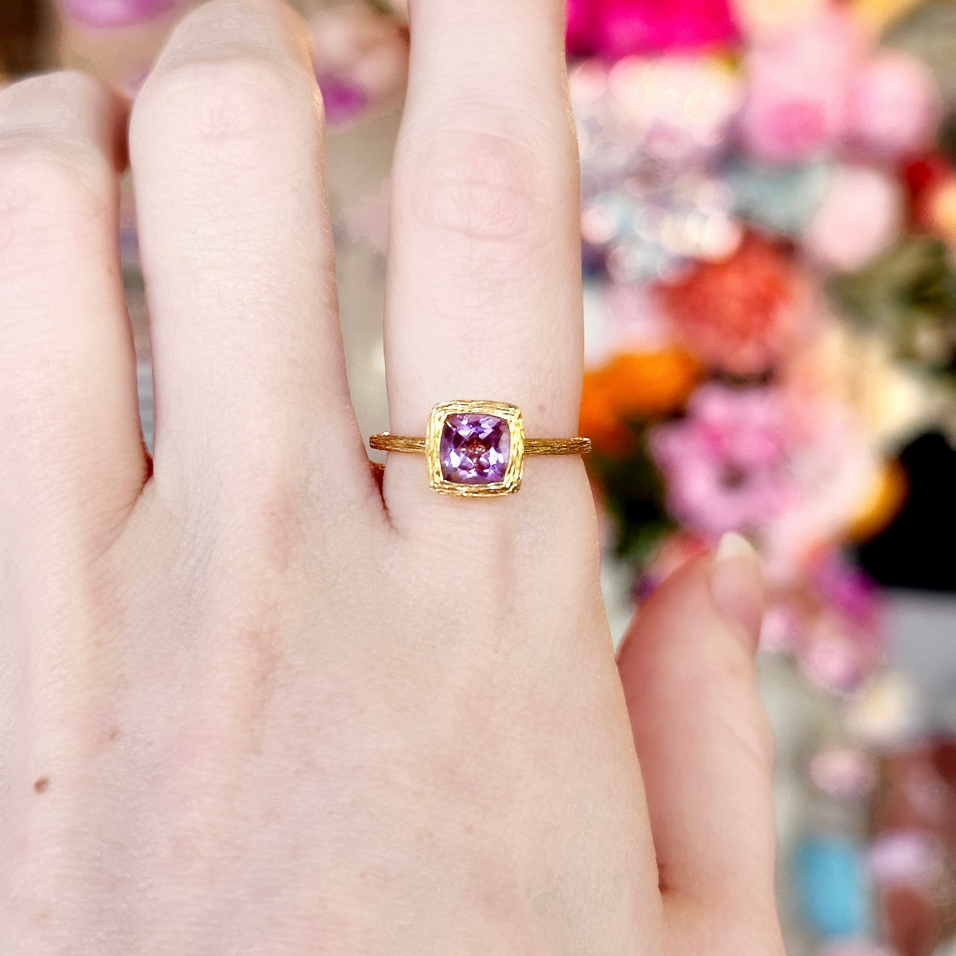 A 14k yellow gold ring featuring a vibrant amethyst, handcrafted in 2.2 grams of gold and finished with intricate hand engraving. Can be worn alone or stacked with other bands!