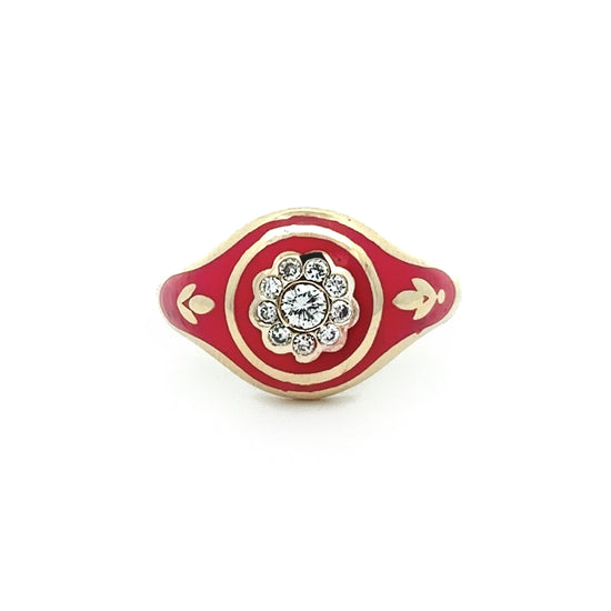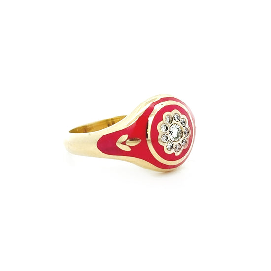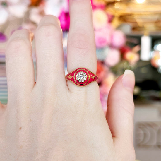 A 14k yellow gold ring featuring hand-applied bright pink enamel and 0.23 carats of round diamonds. Featuring a beautiful flower pattern, she is a remarkable antique treasure that blends historic beauty with timeless brilliance.