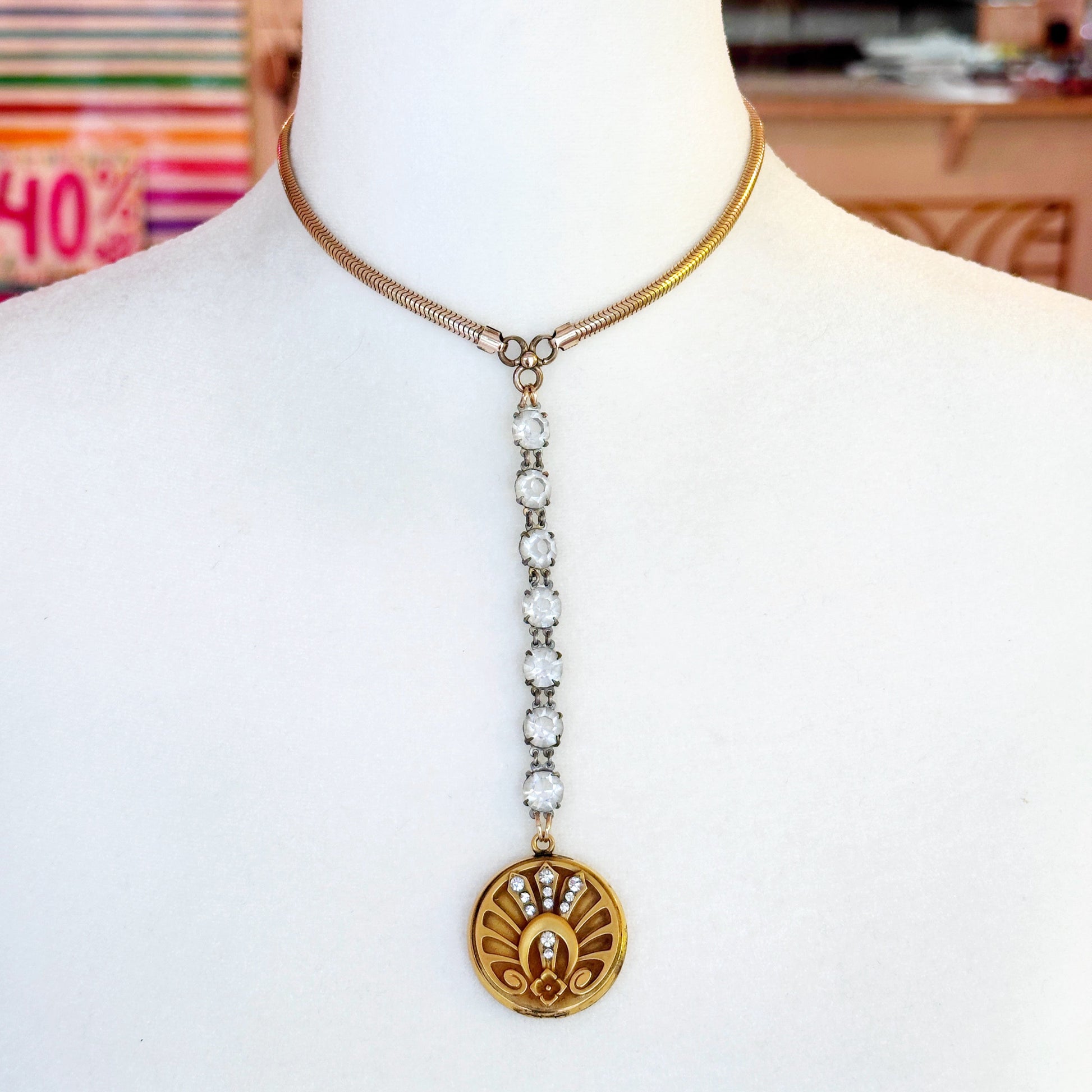 1940's art deco hand fabricated locket paired with glass paste stones. 14k yellow gold filled.