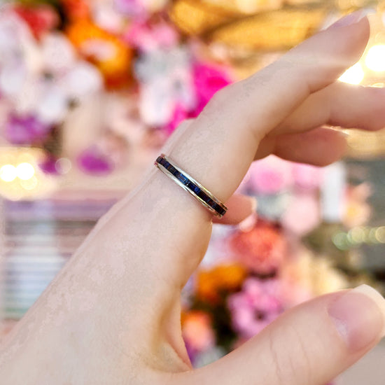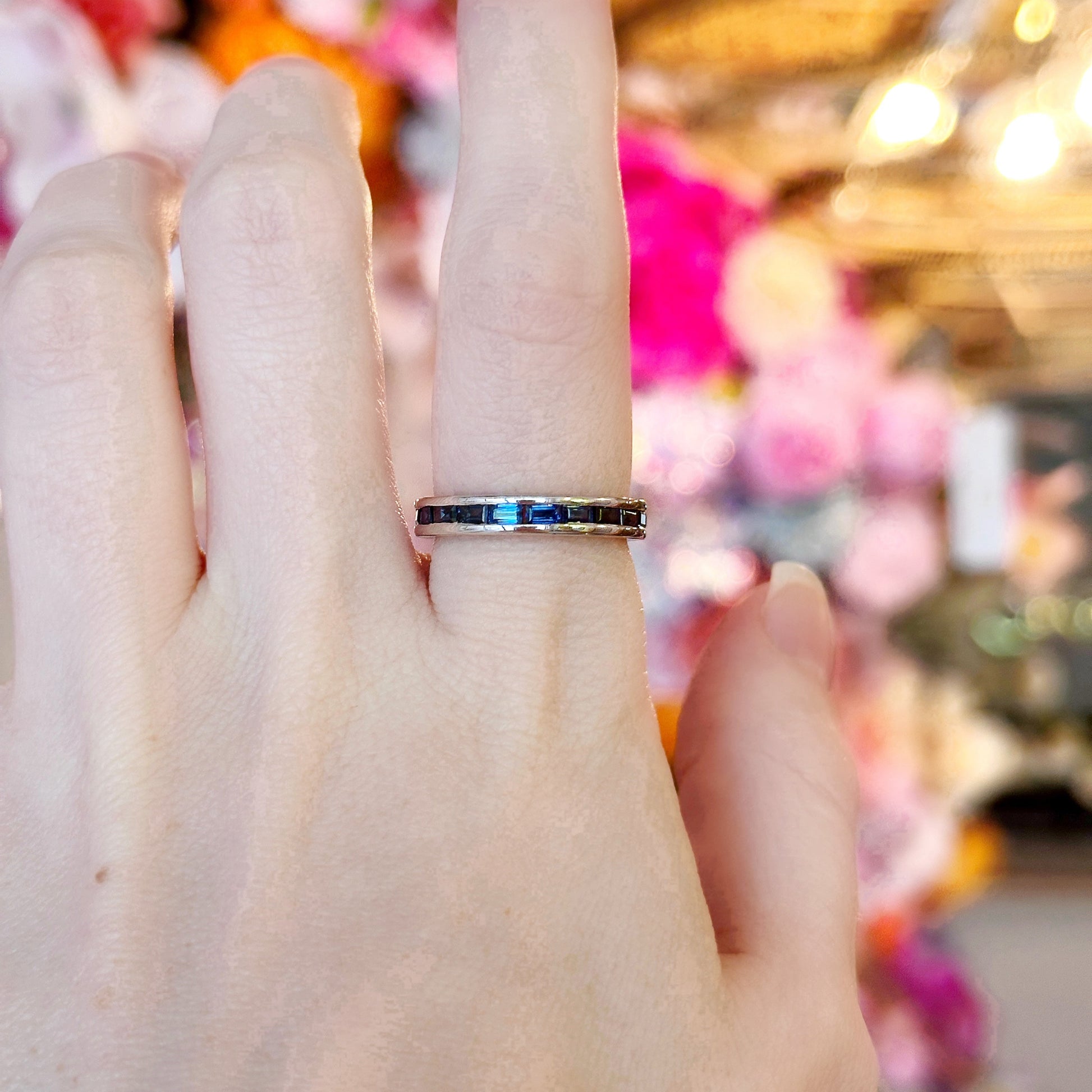 A 1930s Art Deco platinum stackable eternity band featuring natural sapphires totaling approximately 2.7–3 carats. Sleek, geometric, and endlessly vintage—perfect for stacking or wearing solo!