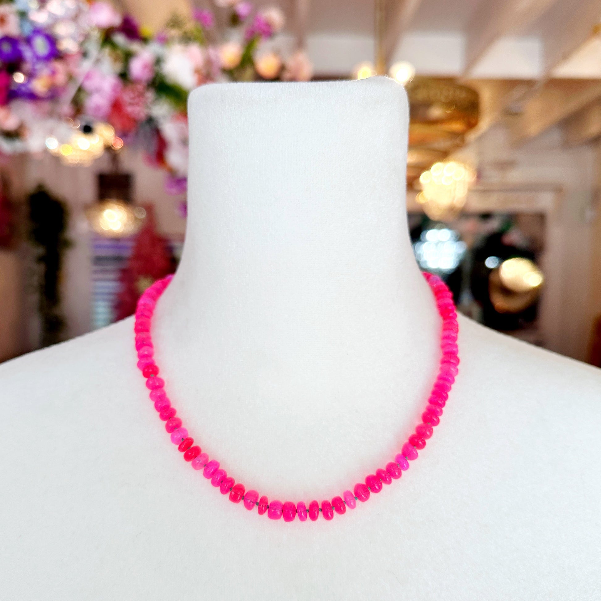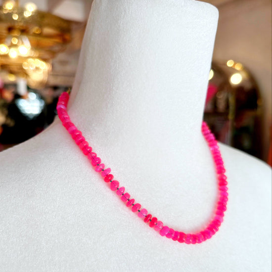 natural hot pink opal necklace hand-knotted on pure silk thread and finished with a 14k yellow gold mechanism. It’s a unique, iridescent piece perfect for adding a POP of color to any layered look!
