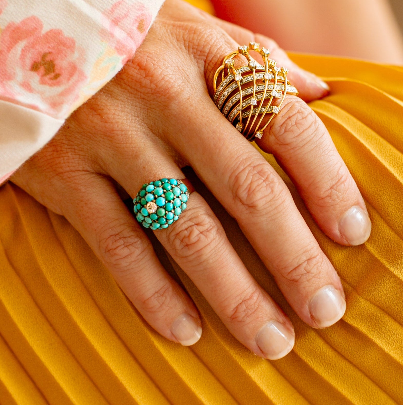 A late 1800s Victorian turquoise and diamond cluster dome ring crafted in approximately 5.5 grams of 18k yellow gold. Featuring diamonds totaling approximately 0.21 carats, this piece exudes antique charm and timeless sophistication.