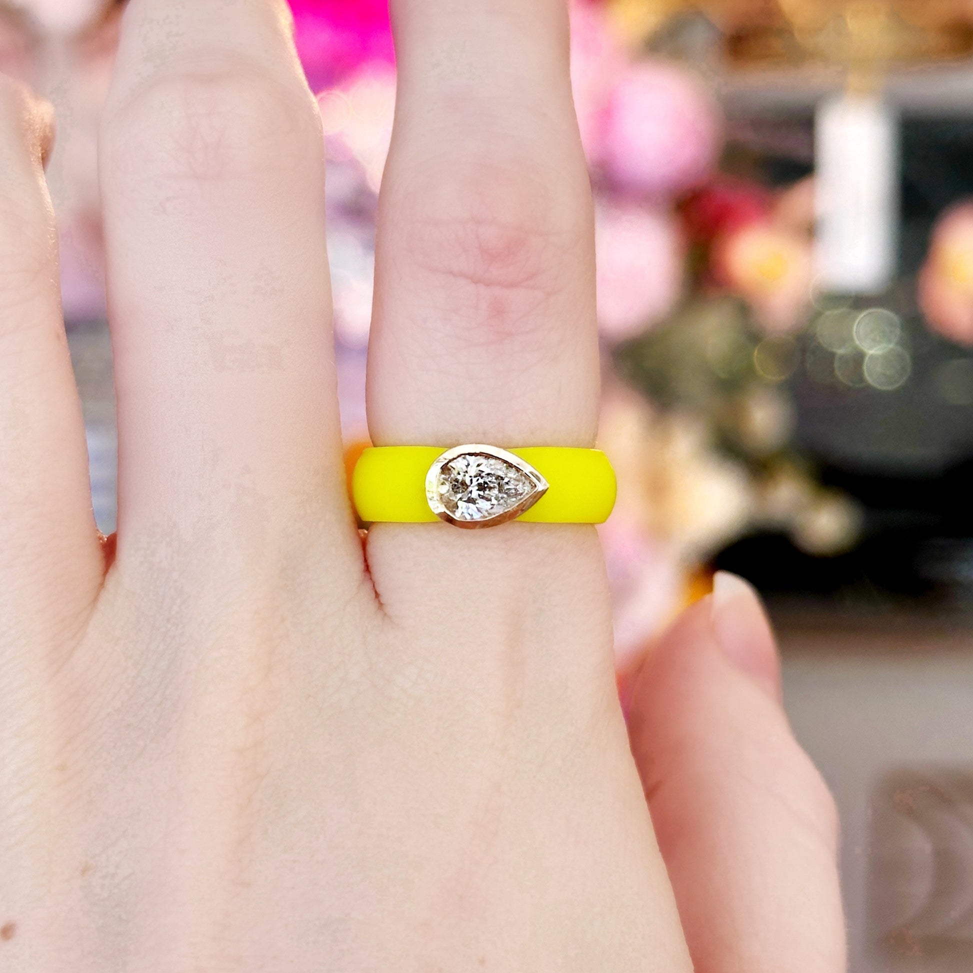 Casual Carats neon yellow silicone band featuring 0.72 ct lab grown pear bezel-set in 14k yellow gold. Featuring a bold, eye-catching neon color, this ring is perfect for adding a little flair to any outfit.