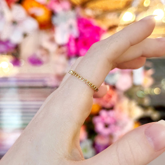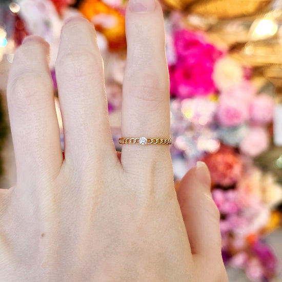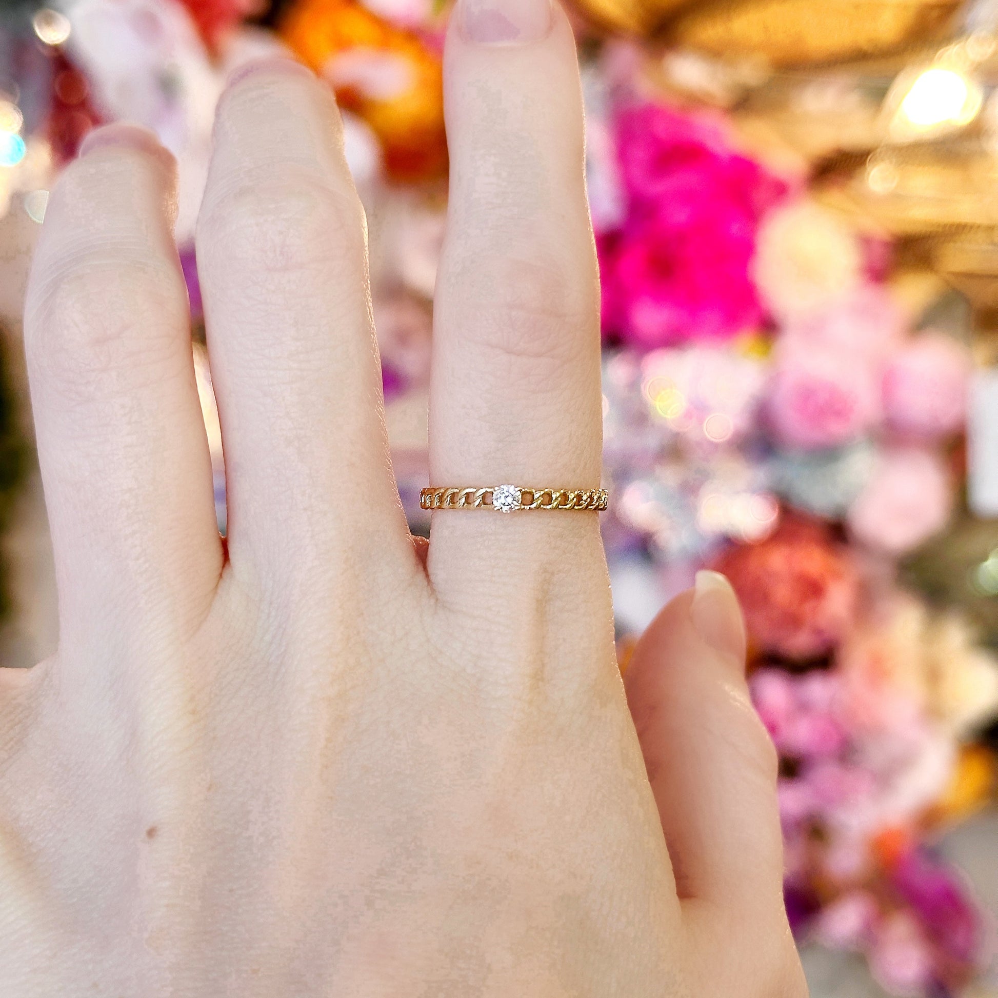 "Toni" in her classic form is a 14k yellow gold ring (1.02 grams) featuring a chain-like pattern and accented by one prong-set diamond (0.08 carats). Subtle, stylish, and perfect for adding a little sparkle to your everyday look!