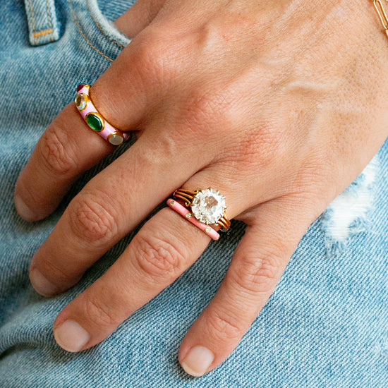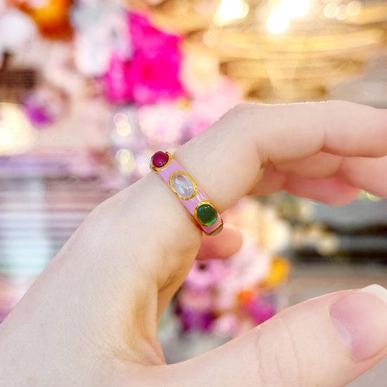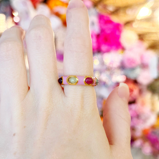 A playful pink enamel ring crafted in 925 sterling silver with 22k gold vermeil, designed to be tarnish-free. Set with a vibrant mix of natural sapphires, emeralds, peridot, moonstone, ruby, amethyst, and carnelian, this piece bursts with color and life.