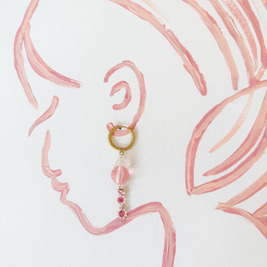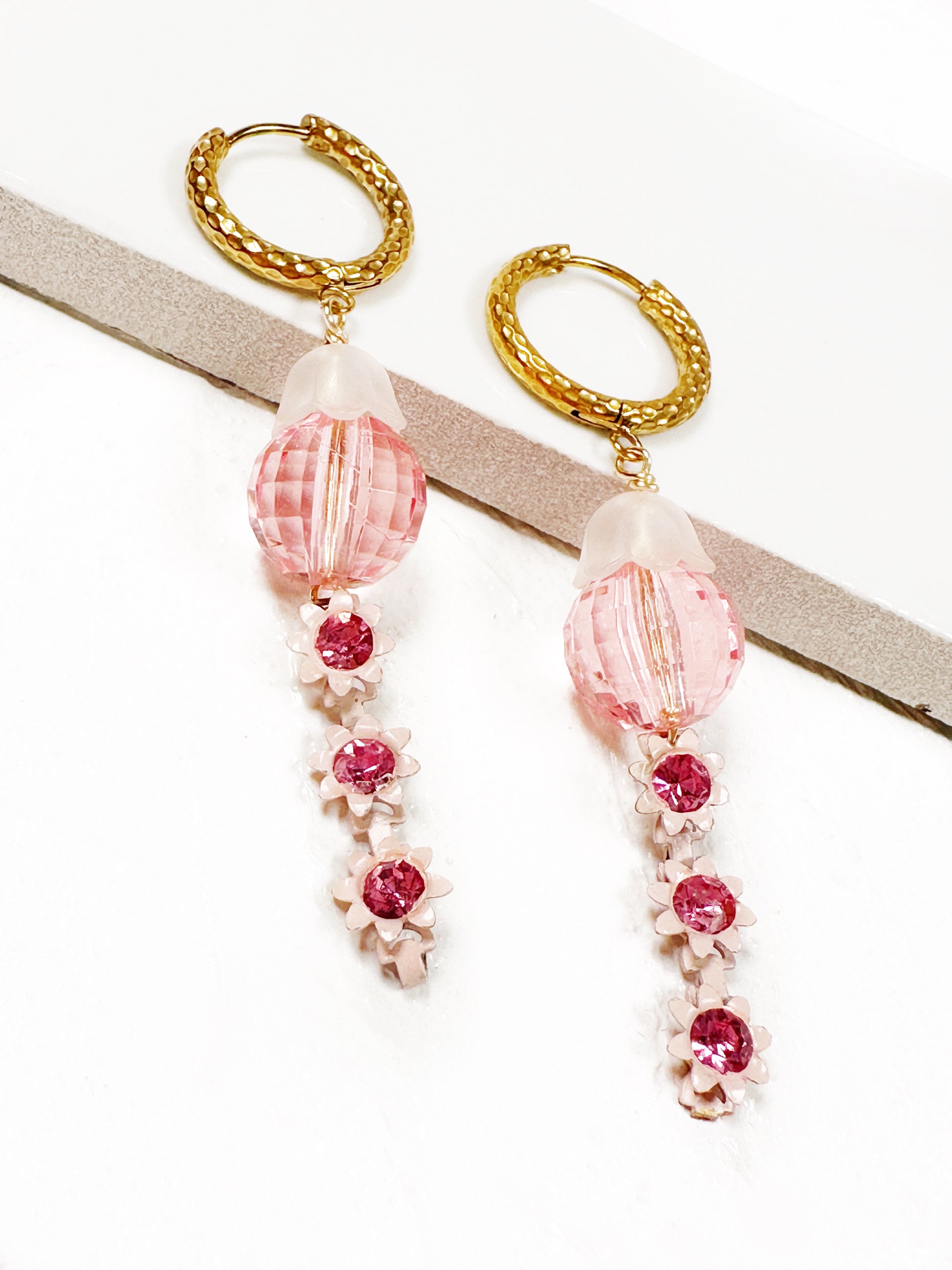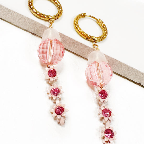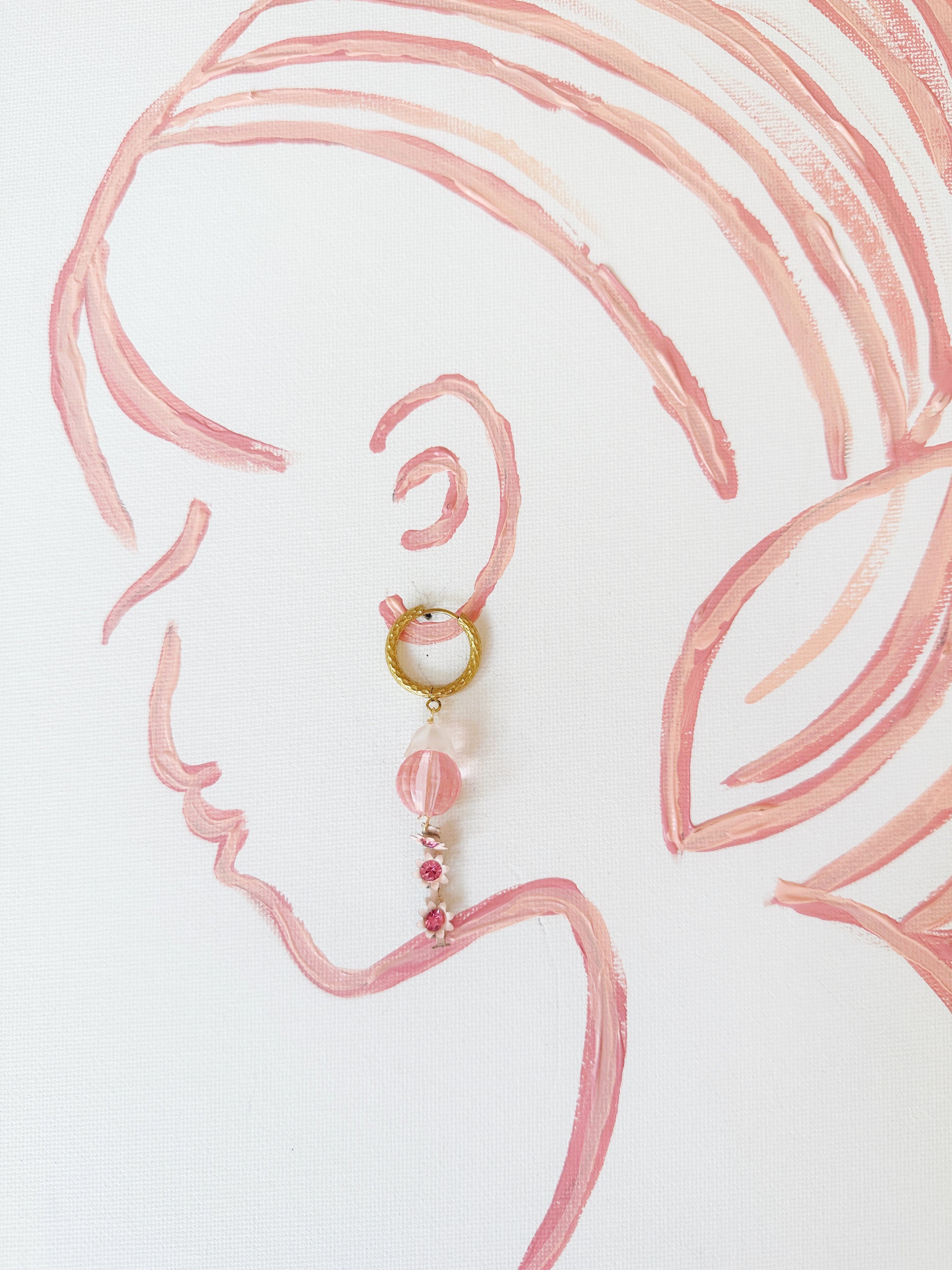 Your quiet courage becomes you. You quietly cultivate your soul AND courageously create your reality. Just like these vintage pink glass beads with flower drops hung from tarnish free, textured hoops, you are simultaneously soft and strong.
