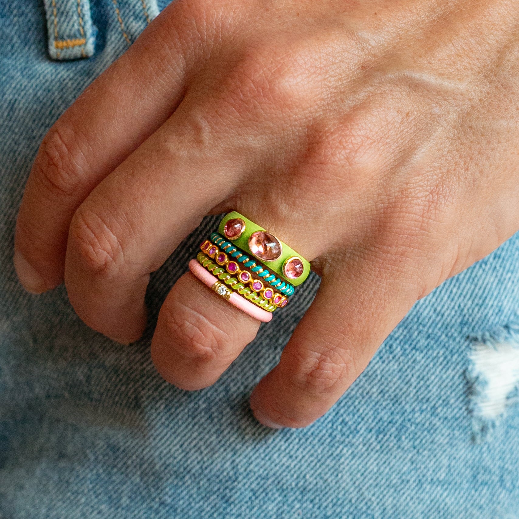Casual Carats 14k yellow gold and neon green ceramic twist band. Mix and match these enamel bands to craft a stack that reflects your personal style.