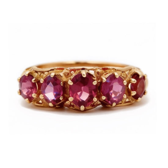 An 1880s Late Victorian five-stone Almandine garnet ring crafted in 14k yellow gold, weighing approximately 2 grams. A classic period piece that wears beautifully on its own or stacked.