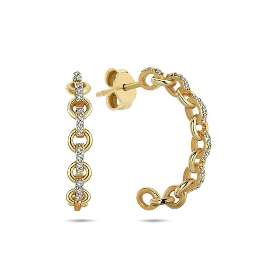 A pair of 14k yellow gold chain link half hoop earrings (1.55 grams) featuring 0.110 carats of F color, SI1 clarity diamonds. Delicate and stylish, these hoops add a subtle sparkle to your everyday look and are perfect for layering with other earrings!