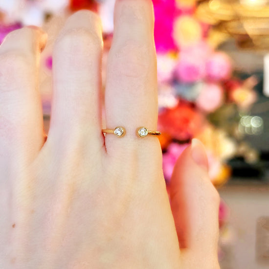 "Lucine" in her original form is a 14k yellow gold open ring (1.35 grams) featuring two bezel-set diamonds (0.130 carats, F color, SI1 clarity), one on each end. Delicate and modern, this ring adds a subtle sparkle to your everyday look and pairs beautifully with other rings for layering.